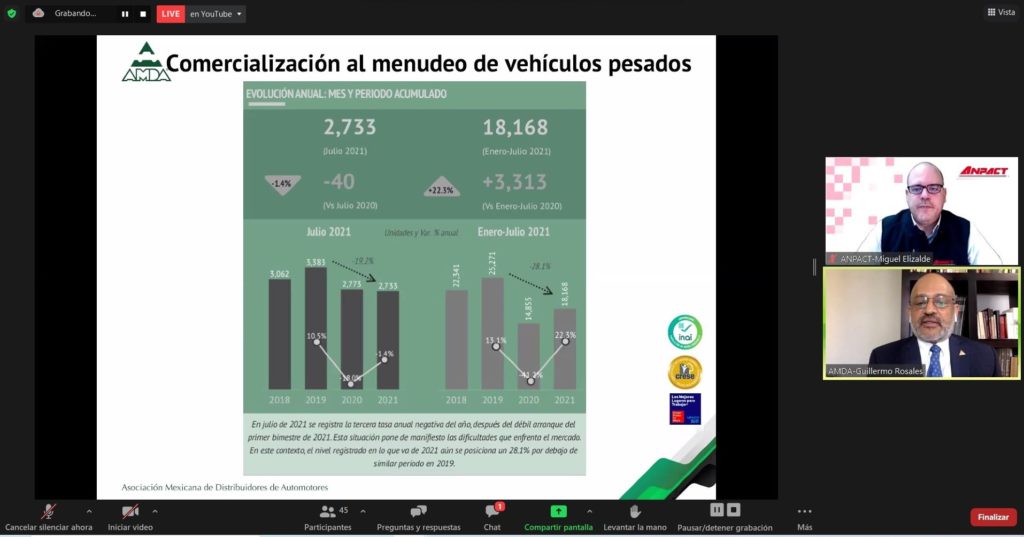 “El mercado al menudeo de vehículos pesados durante el séptimo mes de 2021 presentó una reducción constituyendo la tercera caída anual de 2021, situación que da señal sobre las dificultades enfrentadas por el mercado de vehículos pesados, sumando esta situación al hecho de que aún no se ha superado el nivel de comercialización de 2019”, comentó Guillermo Rosales, director general adjunto de la AMDA.