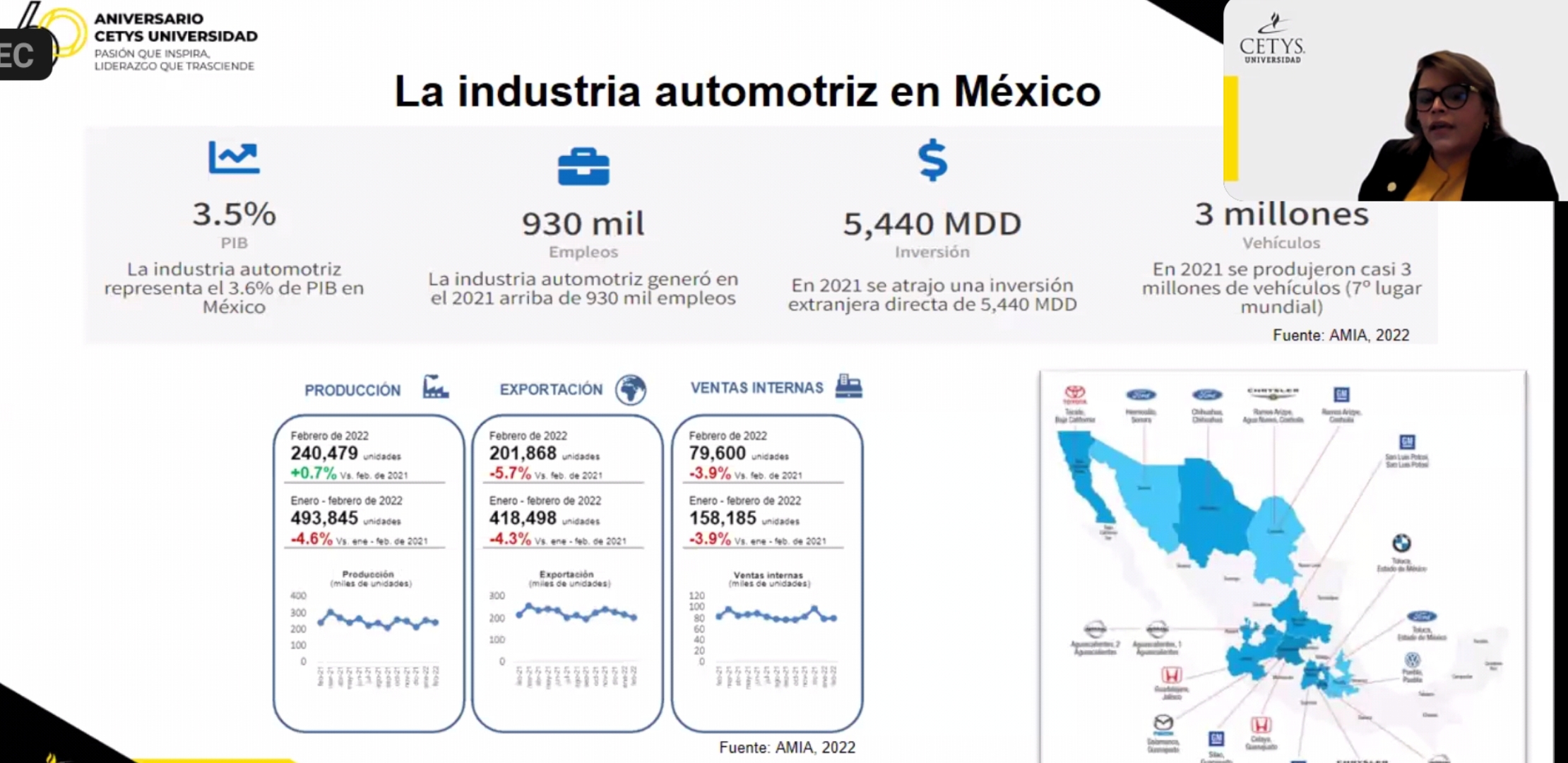 “Ya que en México se produjeron más de 3 millones de vehículos en 2021, la proveeduría de microprocesadores es elemental para la industria automotriz mexicana. Los retos que han impactado durante estos meses son, al principio, los cierres de fábricas, la interrupción de las cadenas de suministro, la alta demanda de procesadores para la industria de electrónicos como celulares, tablets, televisores y PCs, y los problemas de planeación de la demanda”, explicó la Dra. Martínez durante su intervención virtual.
