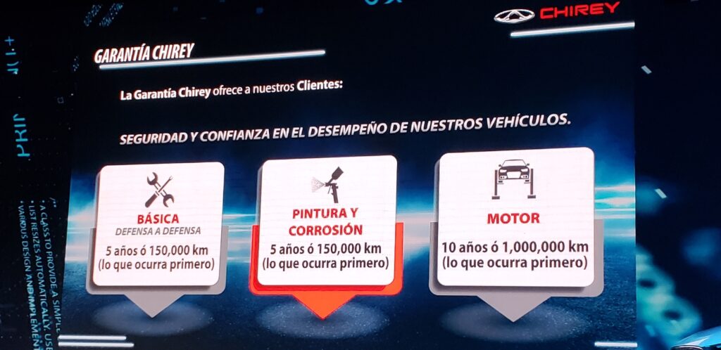 «No hablamos de calidad. Hablamos de perfección», apunta su eslogan. Durante este lanzamiento oficial, José Angel Sánchez, Vicepresidente de Chirey México, dijo que estarán presentes en cada plaza del país, por lo que abrirán 40 agencias prácticamente ya, hasta llegar a 70 este mismo año, y un total de 100 el próximo año.