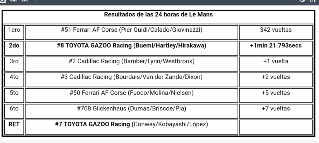 Después de cinco victorias consecutivas en Le Mans, los campeones del mundo aceptaron el desafío contra 16 Hypercar, con competidores de Cadillac, Ferrari, Peugeot y Porsche, con una multitud de 325,000 personas que presenciaron una competencia cardiaca, reñida y llena de emoción de principio a fin.