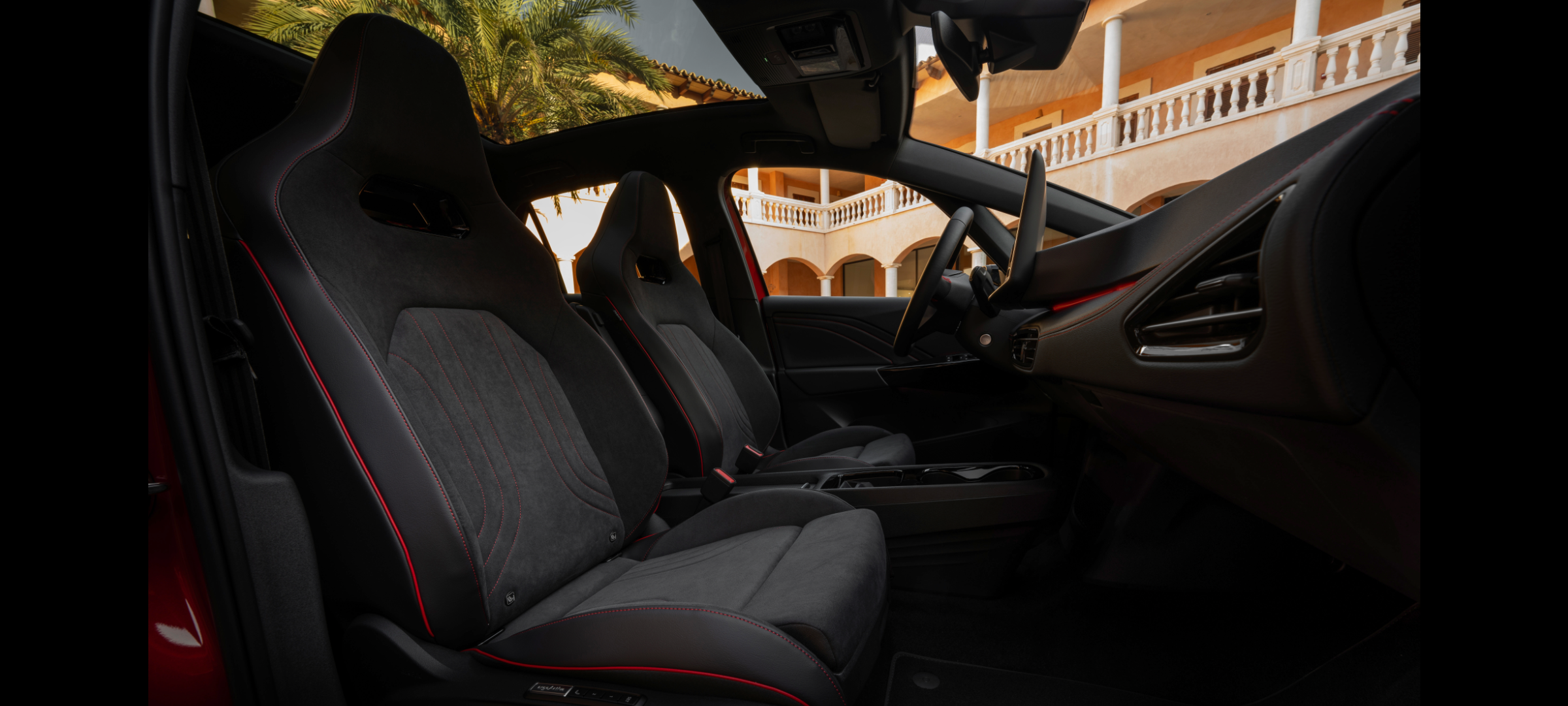 Con su diseño ergonómico, los asientos deportivos Premium (en tela y polipiel) equipados de serie subrayan el carácter deportivo de los modelos ID.3 más potentes. Otro clásico elemento de diseño GTX: asientos con costuras decorativas en color rojo y volante multifunción.