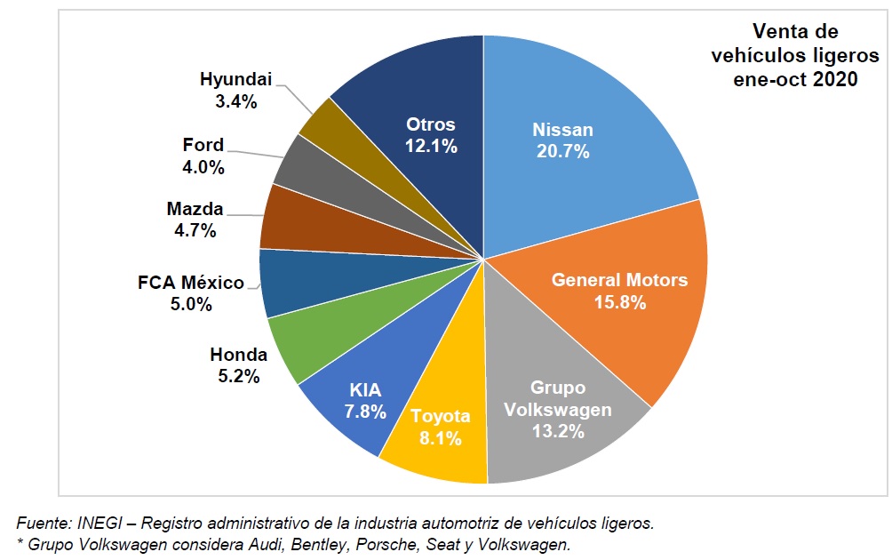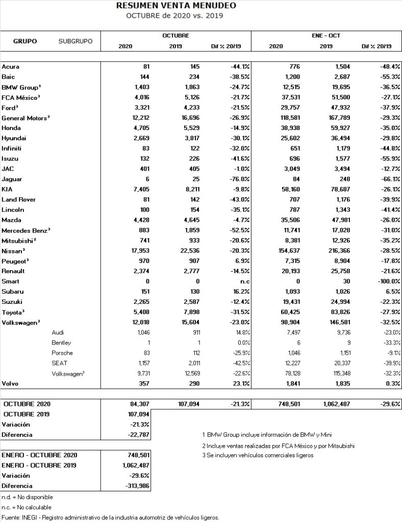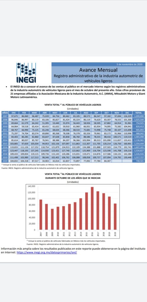 -Caídas de 21.2 y 29.5% en la venta de automotores nuevos en octubre y su acumulado 2020, respectivamente.