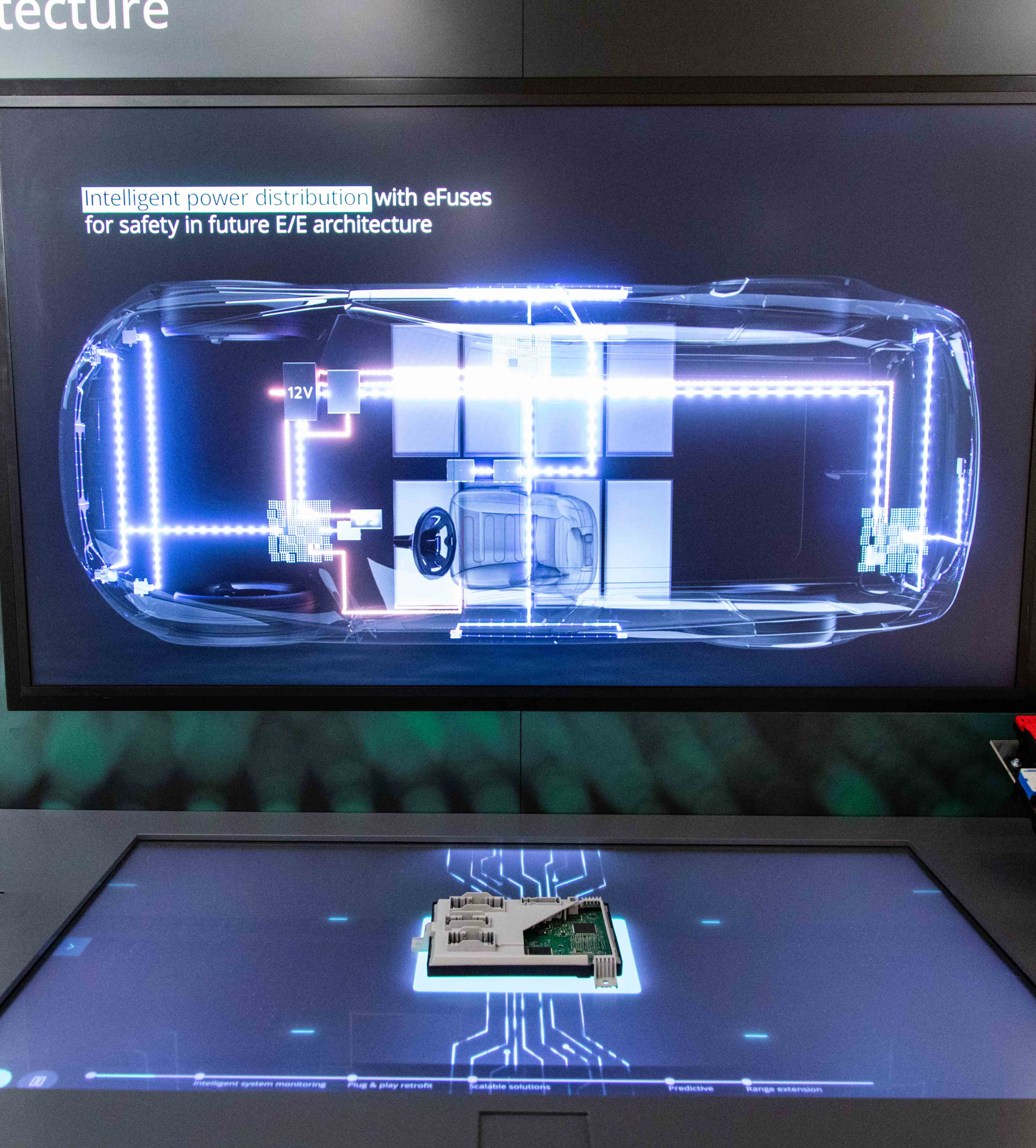 Esto es especialmente importante para la conducción automatizada. Para su adecuado funcionamiento, se utilizan fusibles electrónicos (llamados «eFuses»). A diferencia de los fusibles convencionales, que se funden en caso de fallo y, por lo tanto, quedan inutilizables, el iPDM monitorea constantemente la fuente de alimentación y puede reconocer y contrarrestar posibles áreas problemáticas, como el sobrecalentamiento de los cables, en una fase temprana y antes de que se vuelva crítico.
