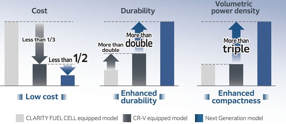 El módulo está siendo desarrollado en forma independiente por Honda como sucesor del modelo actual desarrollado conjuntamente con General Motors (GM). Además de alcanzar una potencia nominal de 150 kW, tendrá un costo de producción que será de la mitad y más del doble de duradero que el modelo actual. Además, el módulo se redujo aumentando la densidad de potencia volumétrica[1] en más de tres veces, lo que aumentó la flexibilidad de los diseños de instalación.