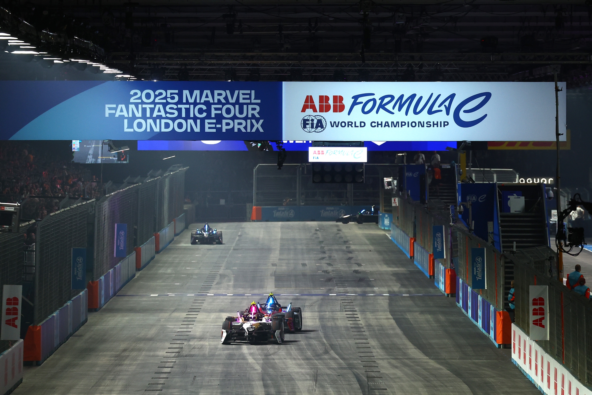 LONDON, ENGLAND – JULY 26: Mitch Evans of New Zealand driving the (9) Jaguar TCS Racing Jaguar I-TYPE 7 leads the race during the London E-Prix, Round 15 of the 2025 FIA Formula E World Championship at ExCel London on July 26, 2025 in London, England. (Photo by Simon Galloway/LAT Images for Formula E)