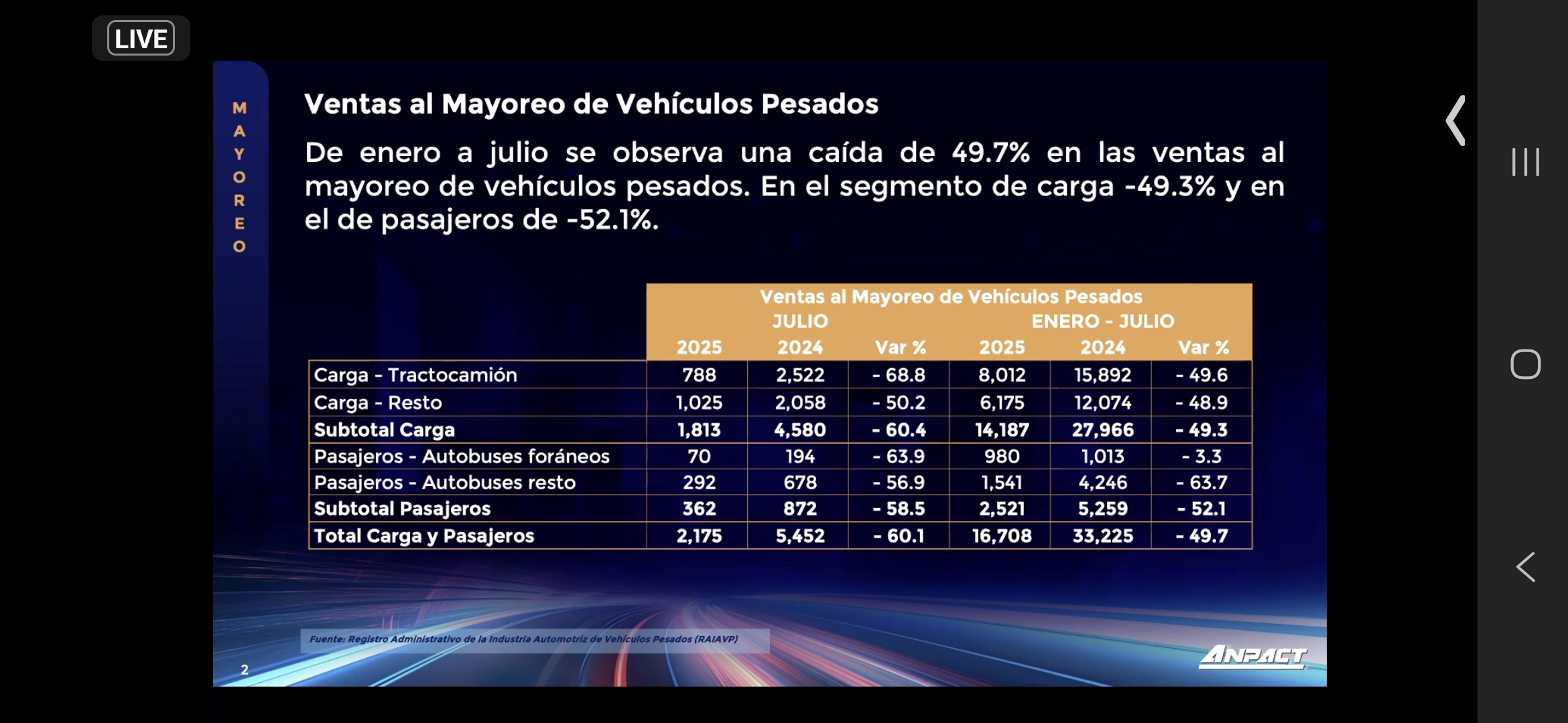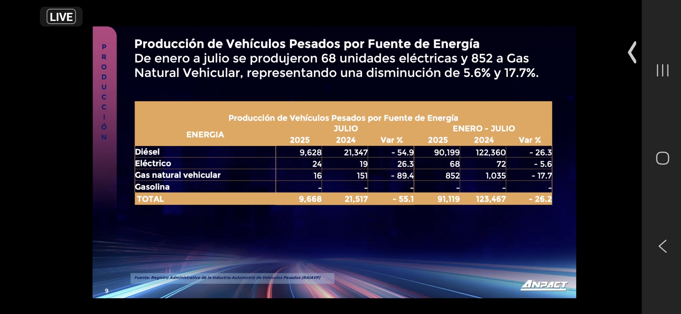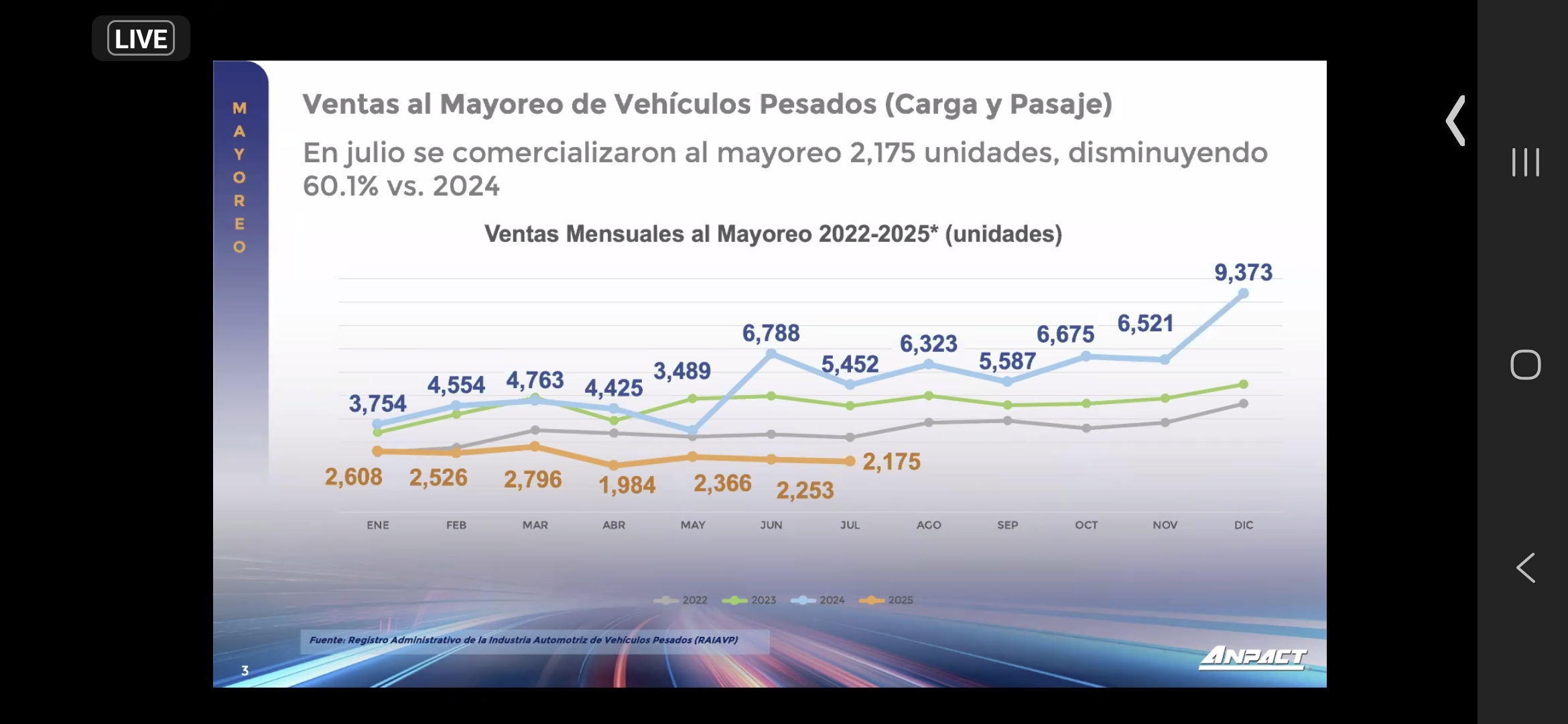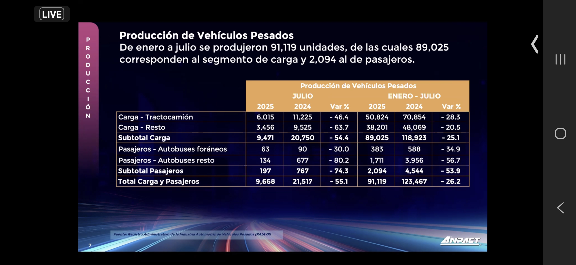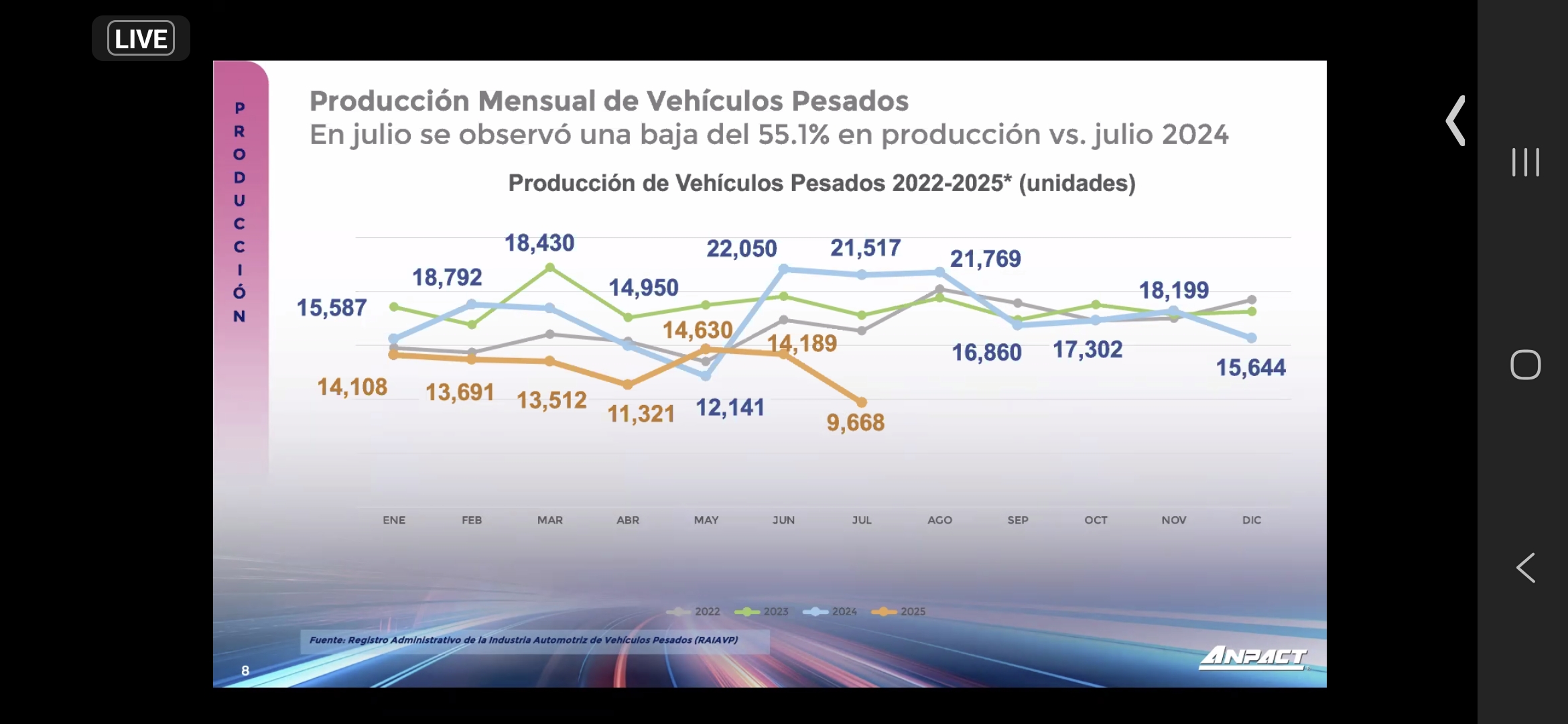 En cuanto a la producción y exportación, el presidente de ANPACT informó que en julio se registró una producción total de 9,668 unidades, lo que representa 55.1% menor respecto al mismo mes de 2024, mientras que las exportaciones alcanzaron 7,867 vehículos, con una variación de 51.6% menor en el comparativo anual.