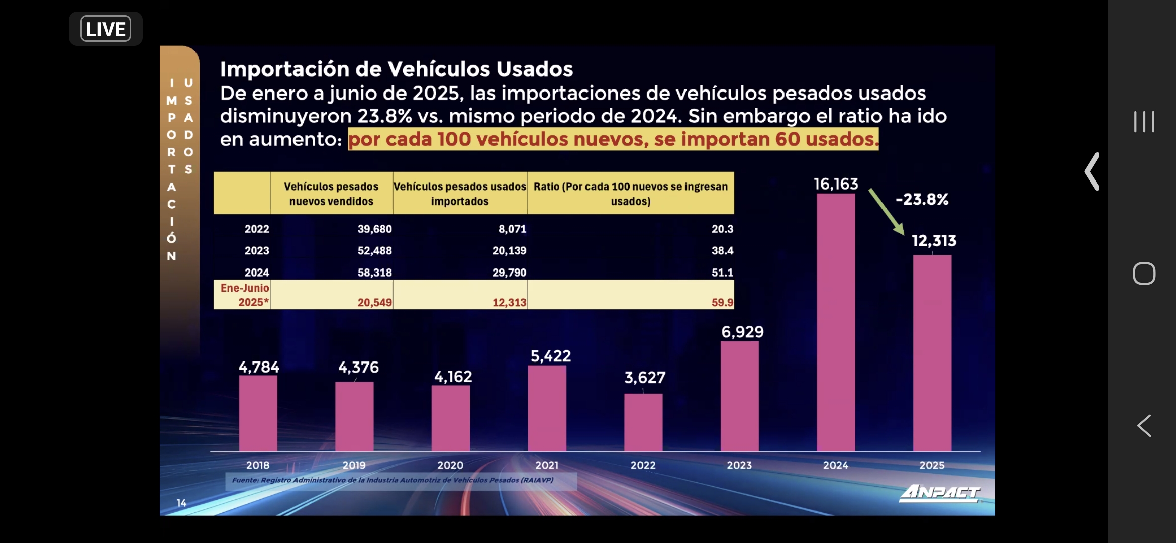 También es urgente frenar la importación de vehículos pesados usados desde los Estados Unidos, cuya cifra se ha triplicado desde 2022 a la fecha y ha permitido que se vendan 60 vehículos usados por cada 100 nuevos comercializados. Por eso, ANPACT trabaja con las autoridades para contener esta importación de unidades chatarra que es nociva para el medio ambiente, para la seguridad vial y para la competitividad del sector.