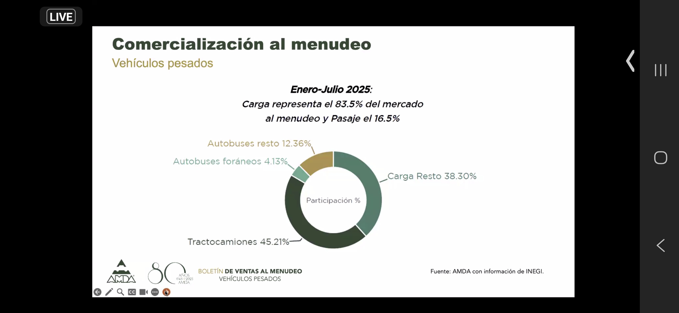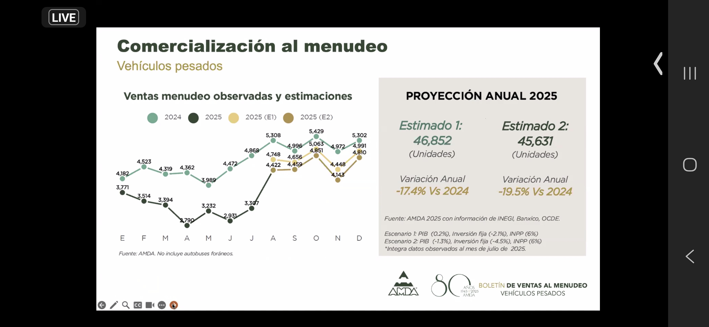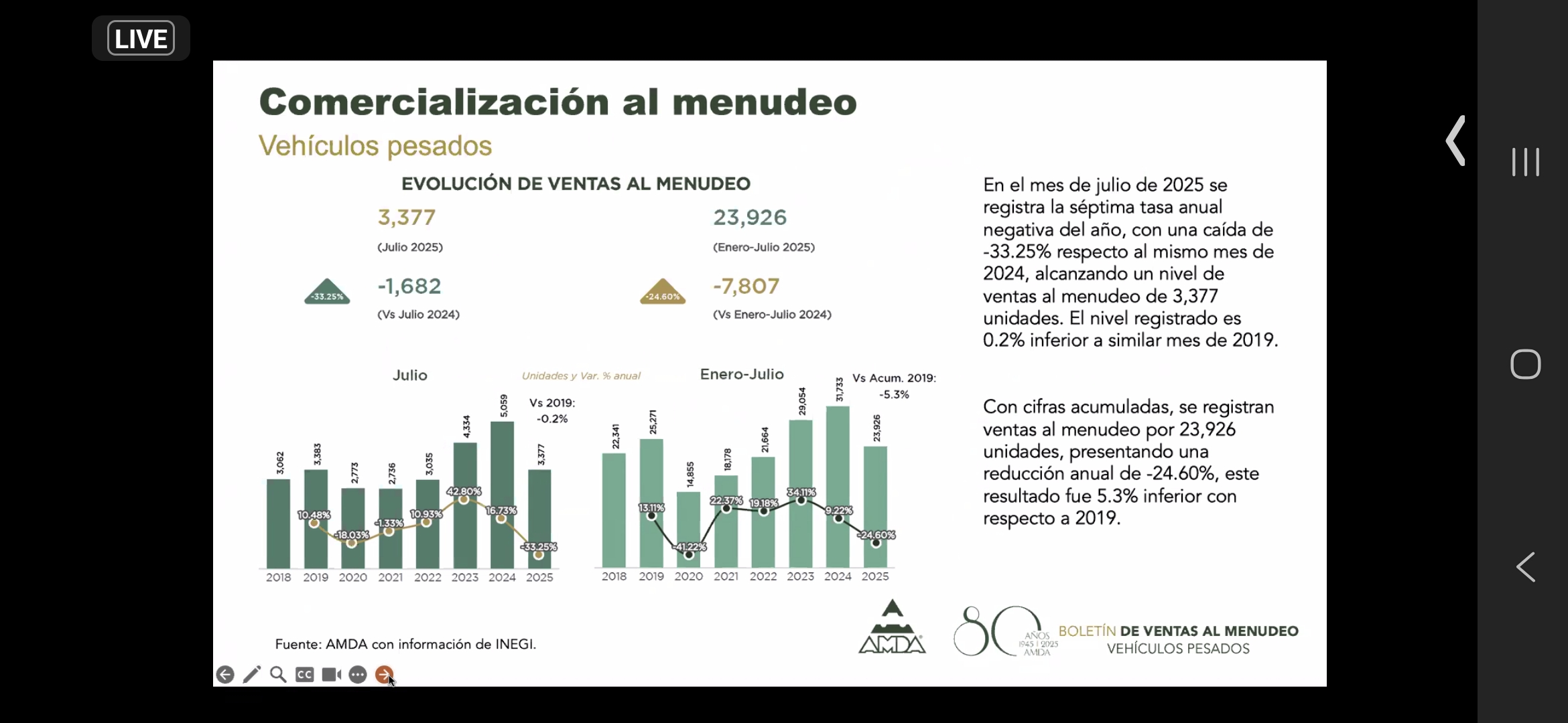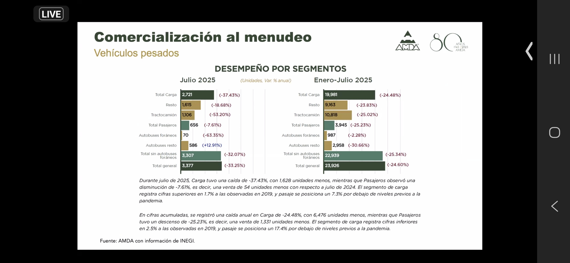 En conferencia de prensa conjunta con ANPACT, el presidente ejecutivo de la AMDA explicó que el resultado de julio representó la séptima tasa anual negativa de 2025 donde la mayoría de las clases y segmentos del mercado presentaron reducciones en comparativa anual con excepción de Autobuses resto que creció 12.9 por ciento.