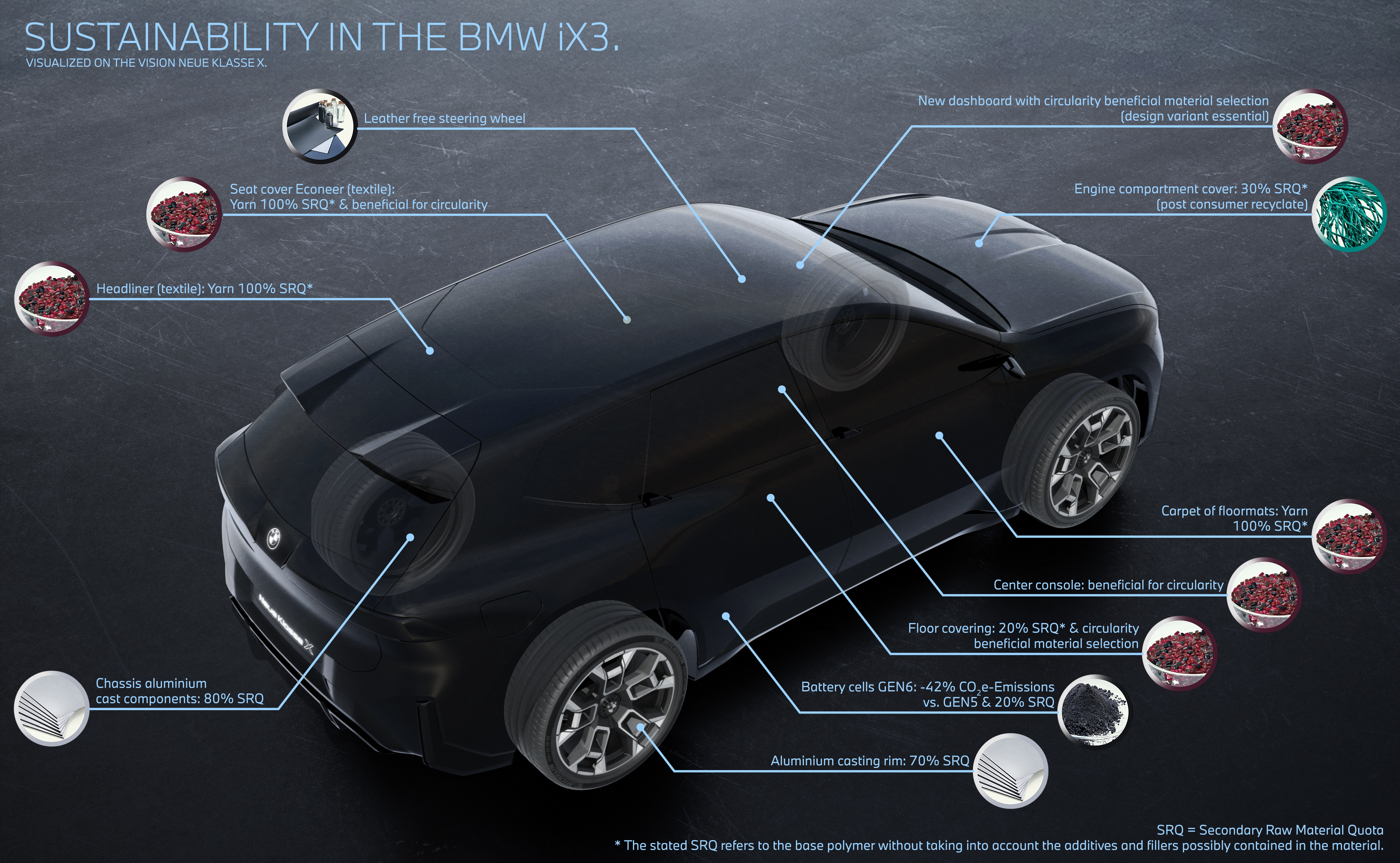 BMW Group se está enfocando cada vez más en el uso de materiales innovadores y secundarios en otros componentes también. Por ejemplo, el 30% de la materia prima secundaria utilizada para la tapa del compartimento del motor y el compartimento de almacenamiento debajo de la tapa delantera es plástico marítimo reciclado. Este material post-consumo consiste en viejas redes de pesca y cuerdas, evitando que estos materiales puedan ser desechados en el océano. El aluminio secundario representa el 80% de los soportes de rueda y los baleros, así como el 70% de los rines de aluminio fundido.