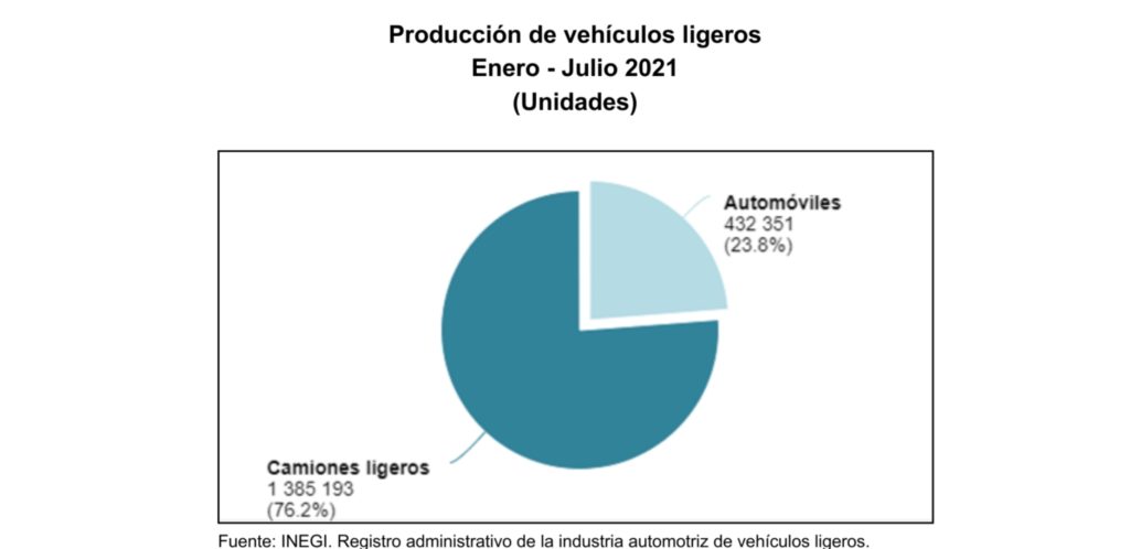 La producción total de vehículos ligeros en el periodo enero–julio de 2021 fue de un millón 817,544 unidades hechas en México, y con ello un alza de 20.2% respecto al mismo periodo del año pasado.