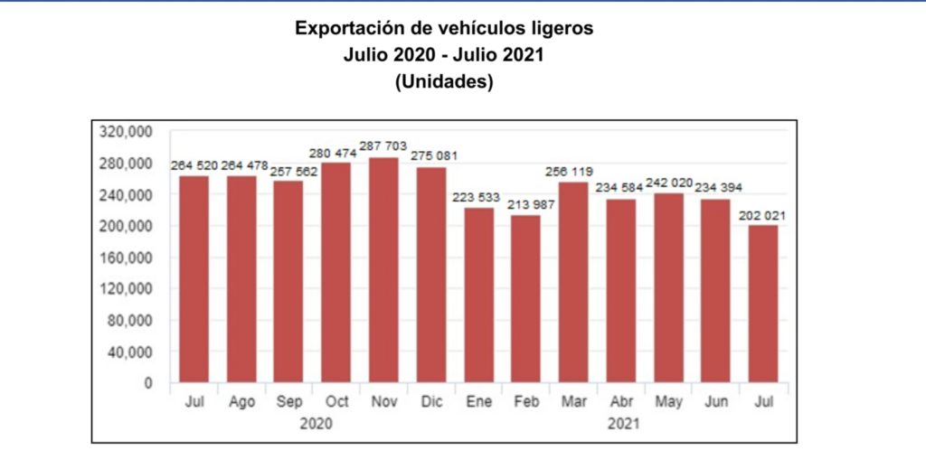 Tan solo en julio se exportaron 202,021 vehículos ligeros y para el periodo enero-julio de 2021 se reportó un total un millón 606,658 unidades exportadas. En este mismo periodo, se presentó una variación de 22.0% respecto a 2020.