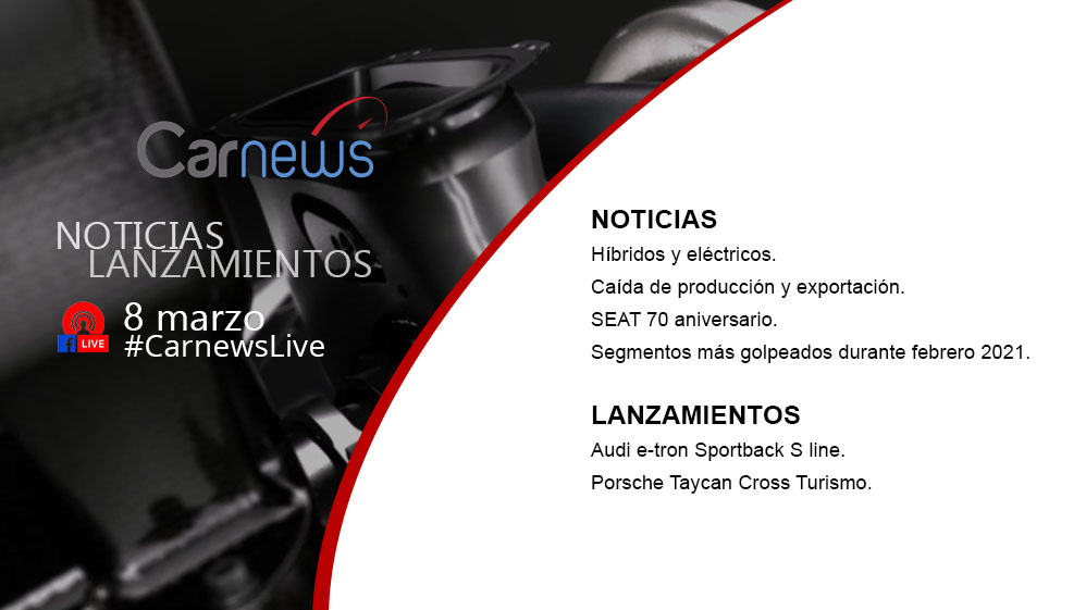 Carnews Live 8 de marzo por Antonio Durán · Publicada 8 marzo, 2021 · Actualizado 10 marzo, 2021 NOTICIAS Híbridos y eléctricos.Caída de producción y exportación.SEAT 70 aniversario.Segmentos más golpeados durante febrero 2021. LANZAMIENTOS +Audi e-tron Sportback S line.Porsche Taycan Cross Turismo. Share