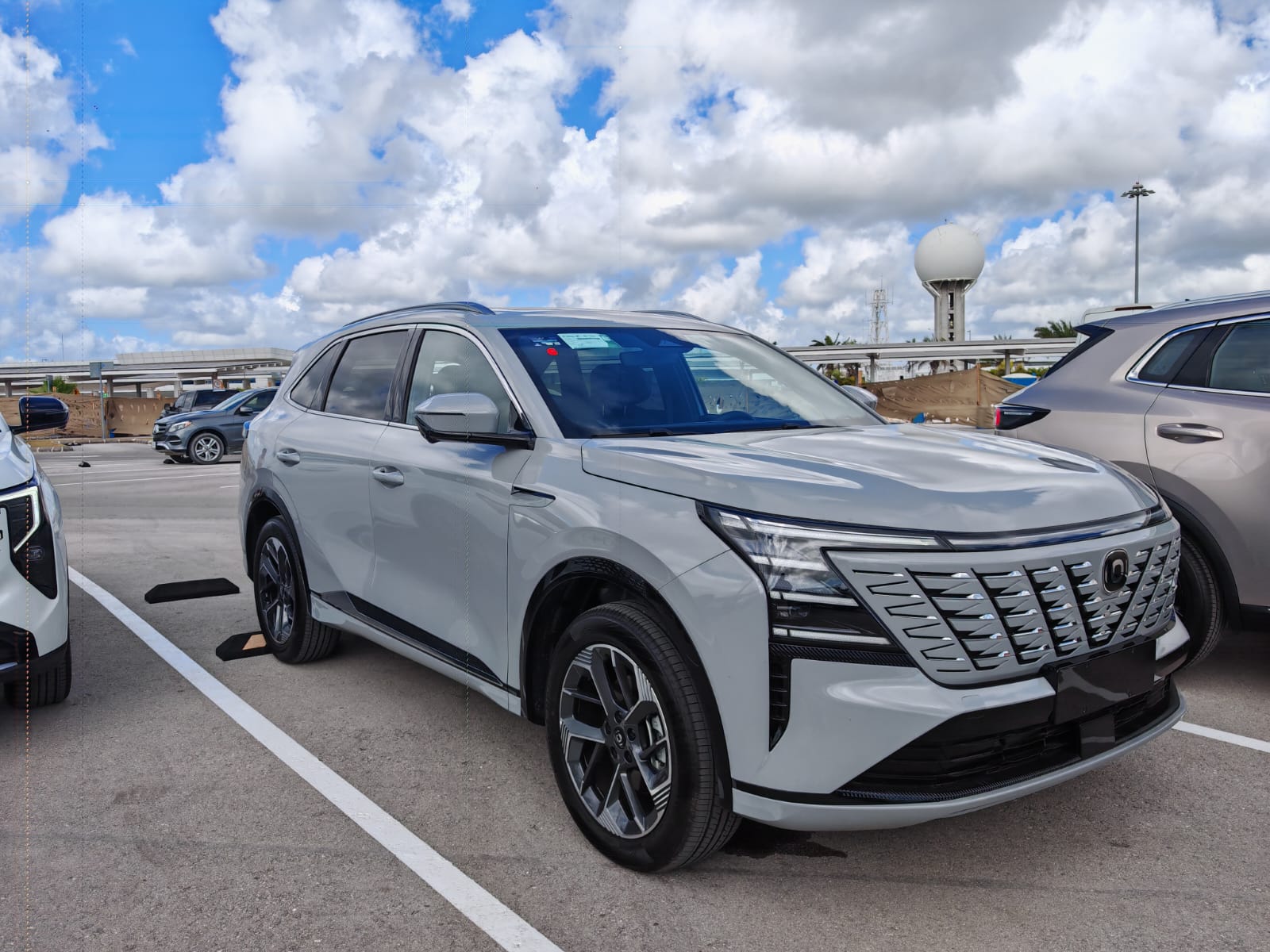 El frontal se distingue por una parrilla amplia con un patrón geométrico que aporta profundidad y sofisticación visual, además de una firma óptica estilizada que refuerza su carácter tecnológico. Las superficies del cofre y la fascia generan una sensación de solidez y modernidad, mientras que las entradas laterales integradas en el diseño enfatizan su postura firme sobre el camino. La silueta lateral presenta una línea de carácter continua que recorre el vehículo de adelante hacia atrás, estilizando el perfil.