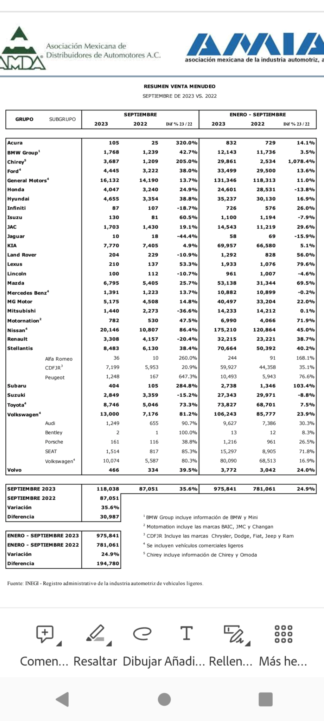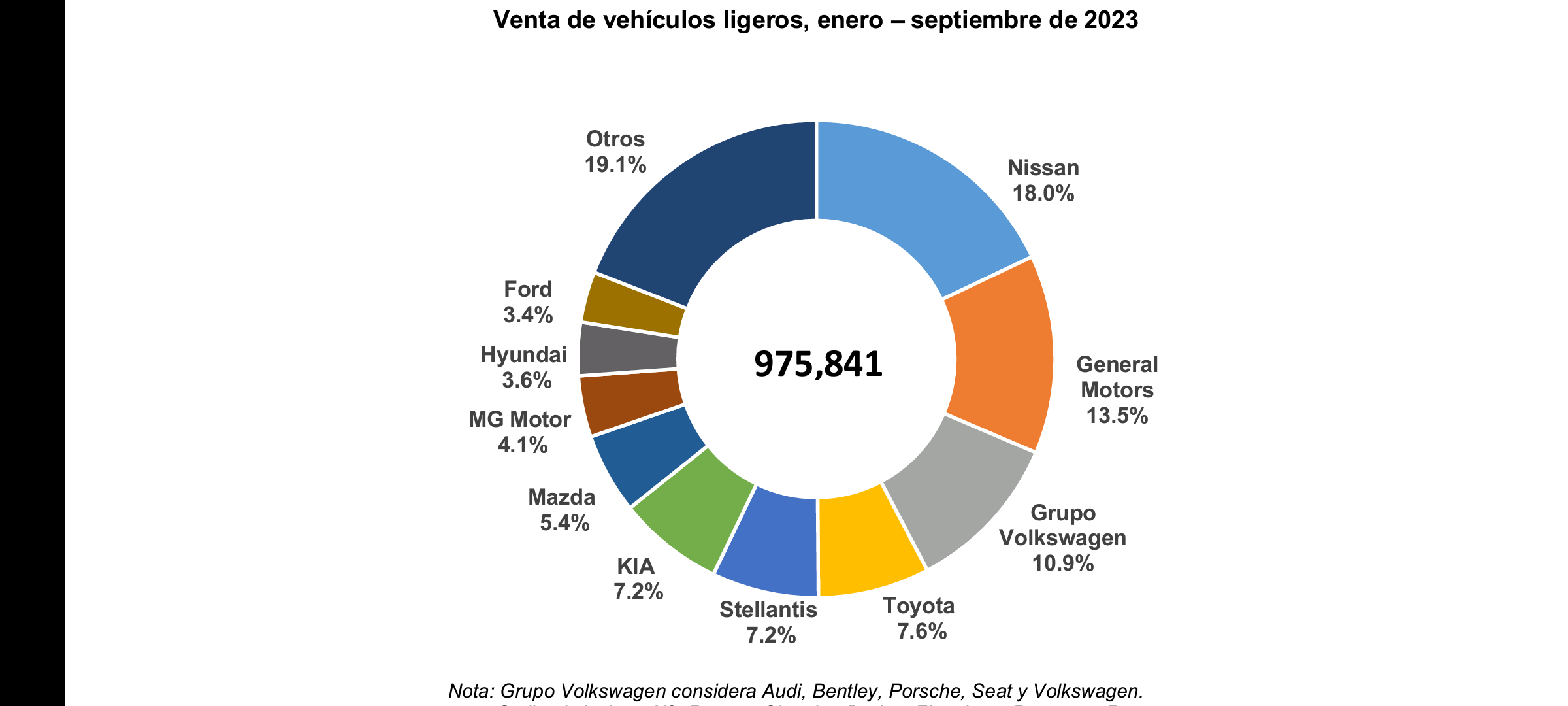 En el periodo enero-septiembre de 2023 se registraron 975,841 vehículos ligeros nuevos vendidos, lo que representa un incremento de 24.9% con respecto a lo reportado durante el mismo periodo de 2022.