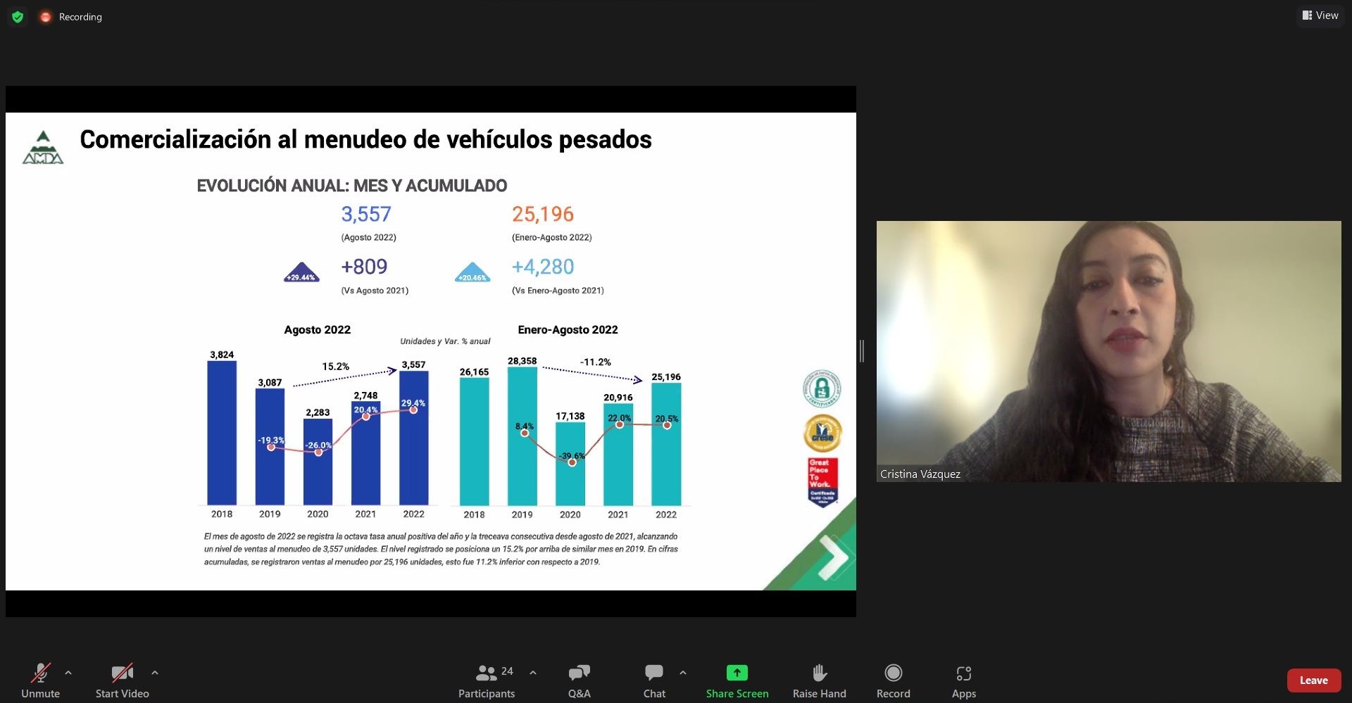 En conferencia de prensa en línea con la Asociación Nacional de Productores de Autobuses, Camiones y Tractocamiones (ANPACT), Cristina Vázquez, coordinadora de Estudios Económicos en representación de Guillermo Rosales Zárate, presidente ejecutivo de la AMDA, comentó que con agosto de 2022 se sumó la octava tasa anual positiva del año y la treceava consecutiva desde agosto del año pasado.