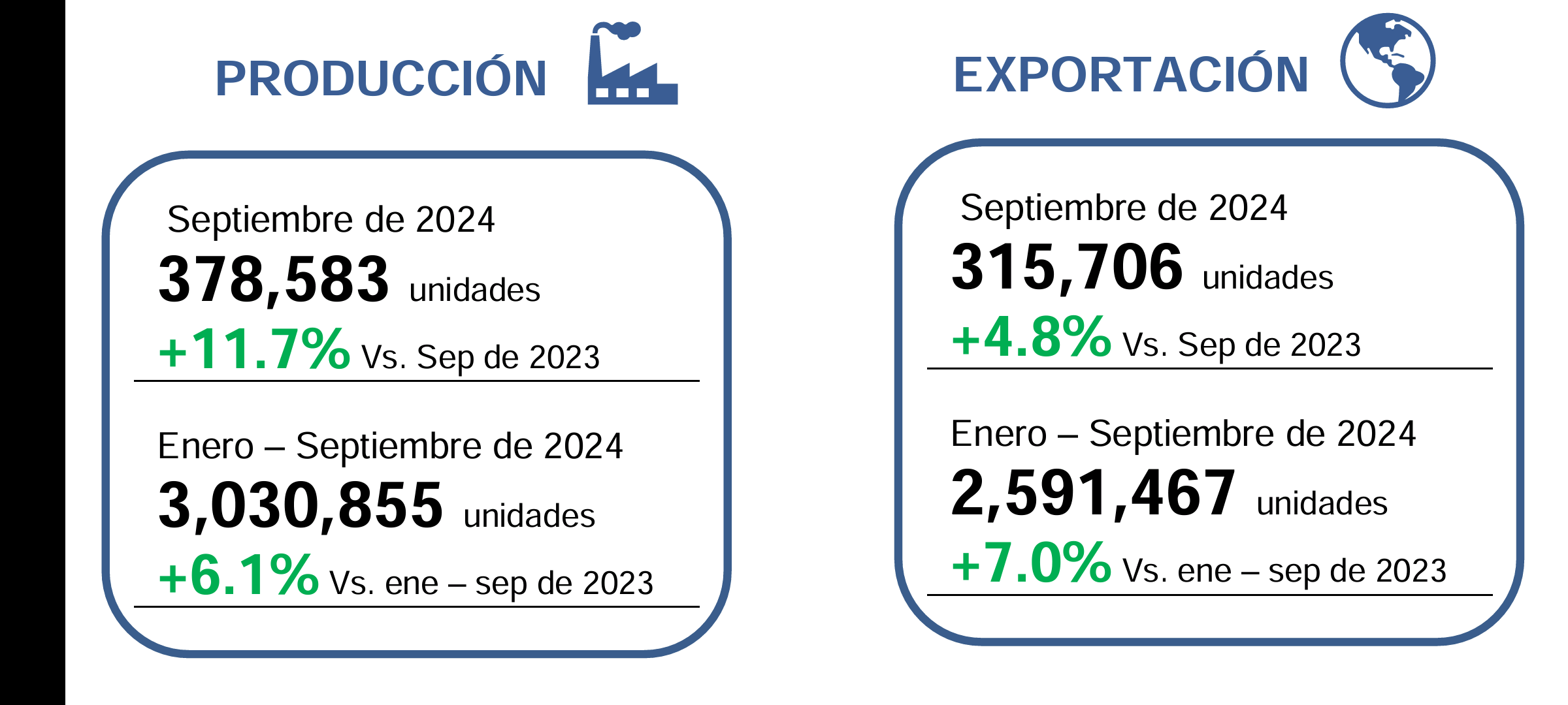 Y lo mismo se puede decir en el rubro de las exportaciones para el mes de septiembre, de tal forma que se produjeron 378,583 unidades, lo que representó un crecimiento del 11.7% en comparación con las cifras reportadas para el mismo mes de 2023.