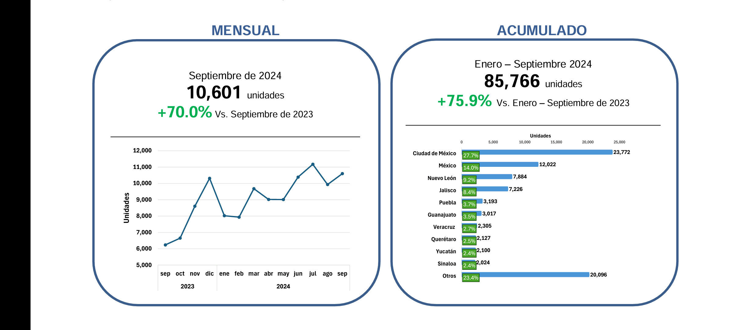 De enero a septiembre de 2024, se han vendido 85,766 vehículos con este tipo de tecnologías, representando un crecimiento de 75.9% en comparación con las cifras del mismo periodo de 2023.