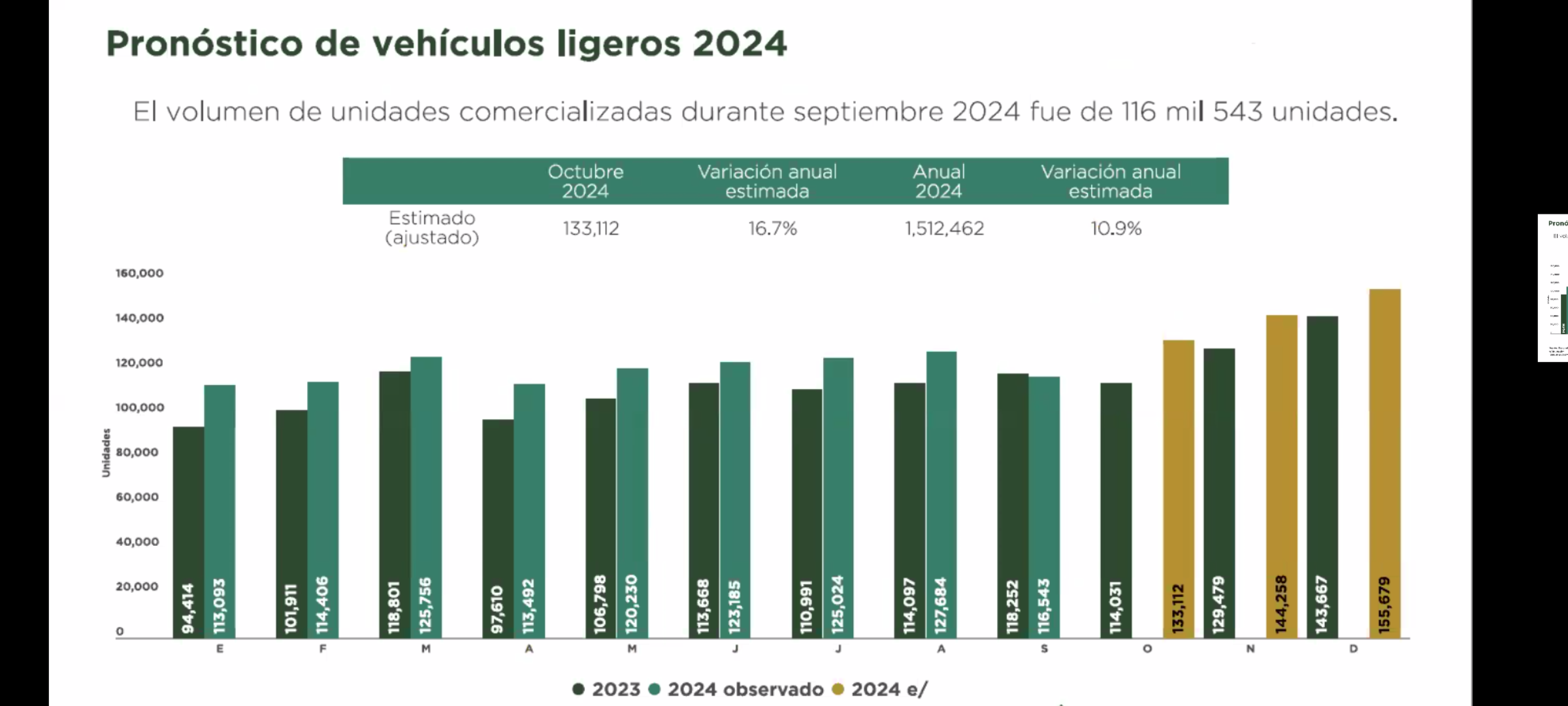 El pronóstico para octubre es de 133,112 vehículos vendidos, lo que representaría un crecimiento de 6.79% respecto al mismo mes del año pasado, y con ello una venta total para el cierre del año de un millón 512,462 unidades.