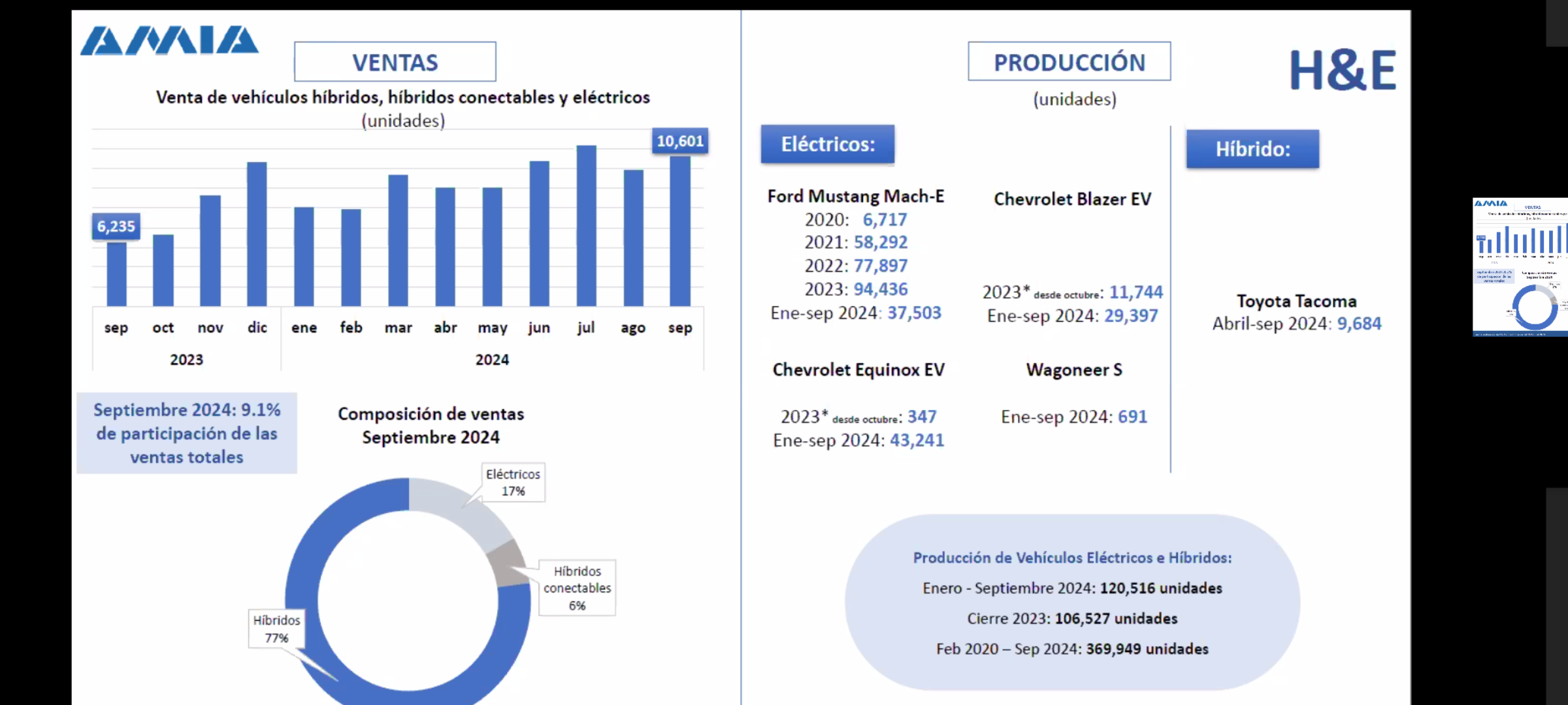 Durante septiembre de 2024 la venta de vehículos híbridos, híbridos conectables y eléctricos fue de 10,601 unidades, llegando a 9.1% del total de ventas.