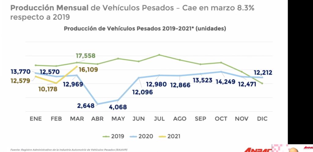 La venta al menudeo de vehículos comerciales pesados durante marzo de 2021 fue de 2,702 unidades, lo que representó un avance de 18.82% respecto de marzo de 2020, equivalente a 428 unidades adicionales.