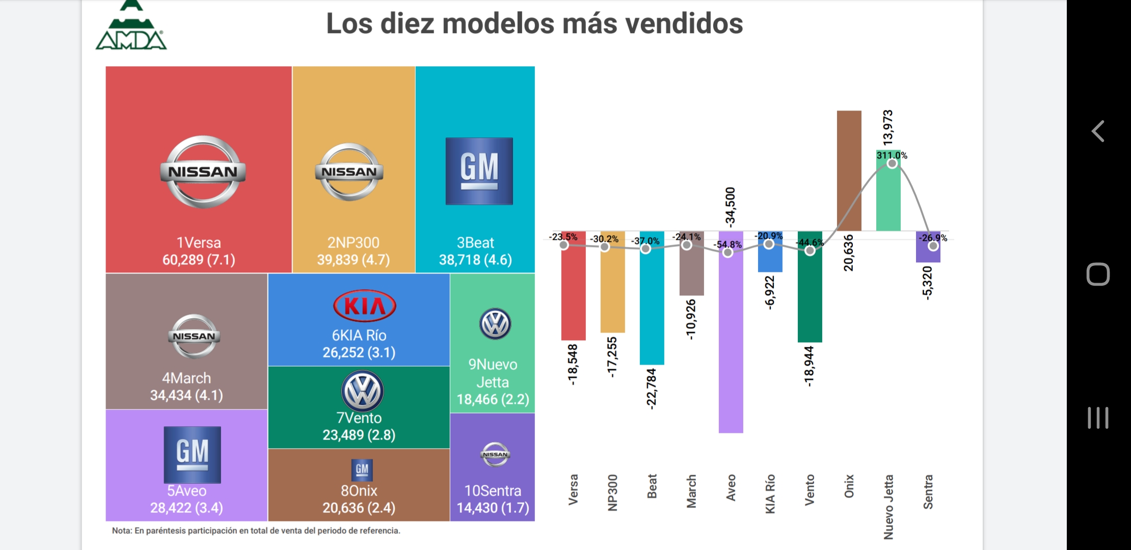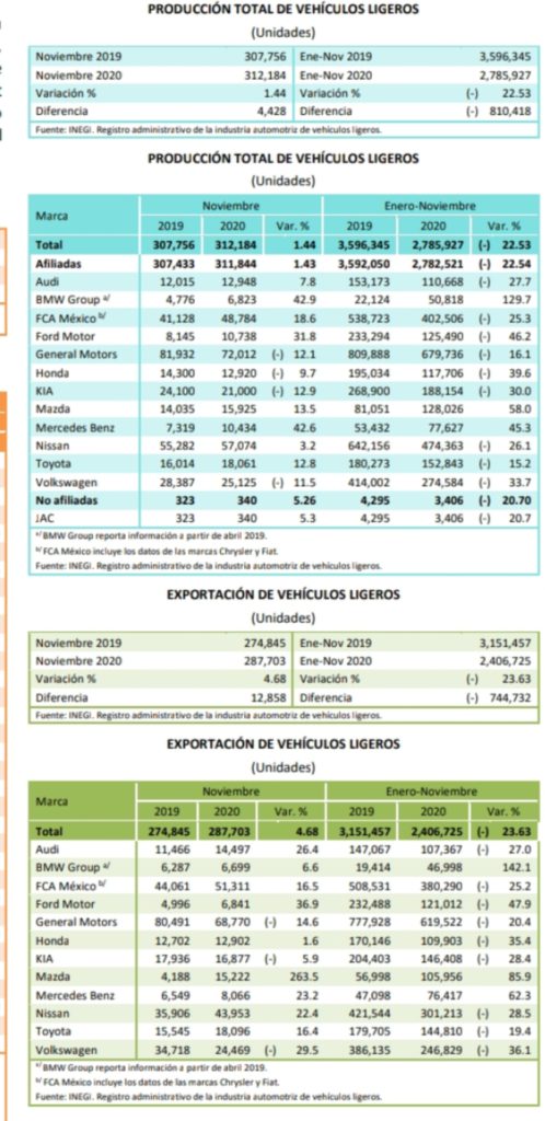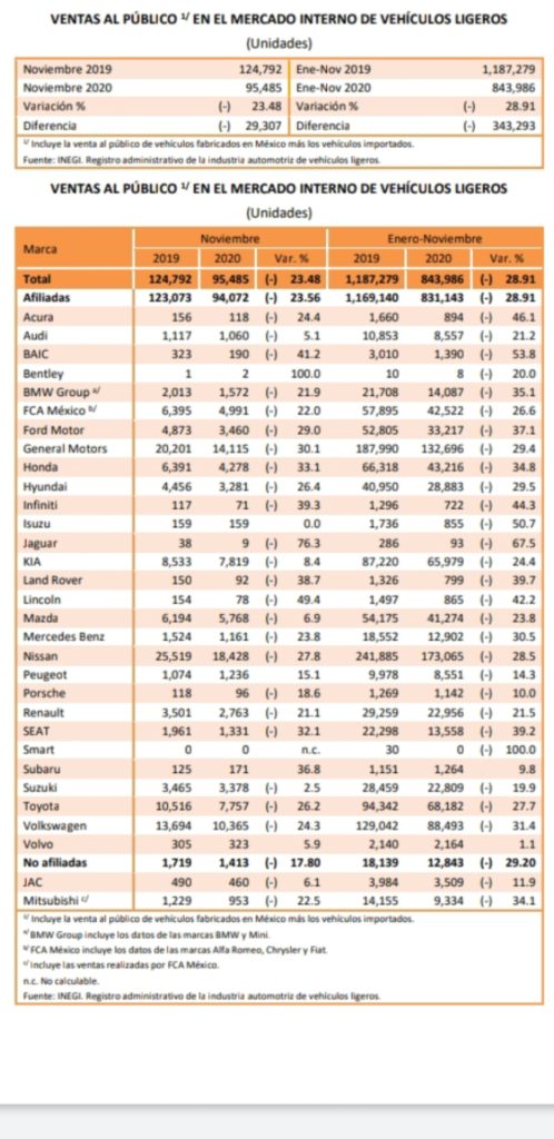 Y en las cifras acumuladas de enero a noviembre se han comercializado 843 mil 986 vehículos ligeros, lo que representa una caída del 28.91% respecto al año pasado.