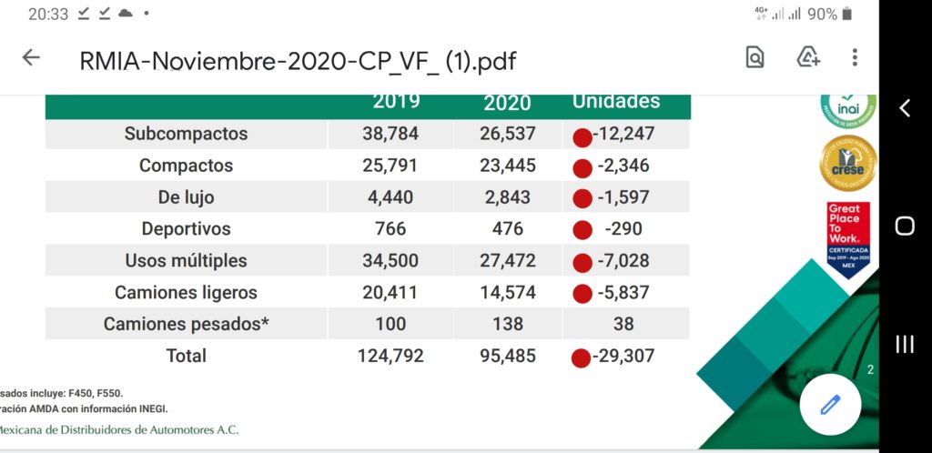 Sobre la venta de unidades ligeras nuevas en noviembre de 2020, Rosales Zárate corroboró que se colocaron 95 mil 485, significando una baja de 23.5% en comparación al mismo mes del año pasado cuando se comercializaron 124 mil 792, 29 mil 307 menos.