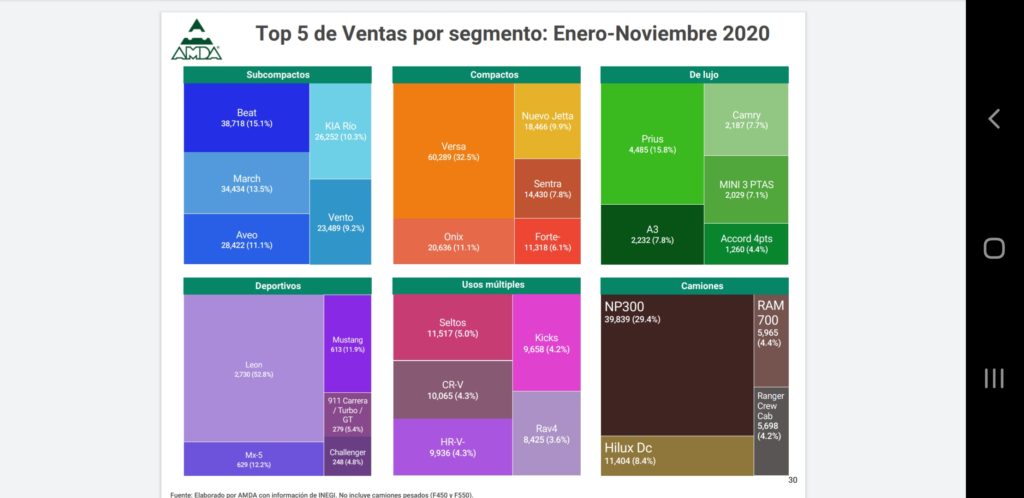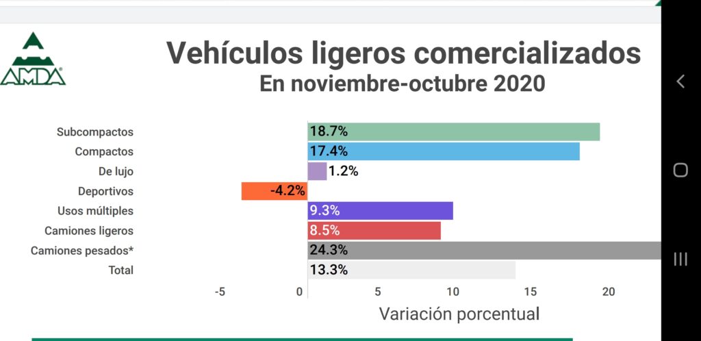 Sobre la venta de unidades ligeras nuevas en noviembre de 2020, Rosales Zárate corroboró que se colocaron 95 mil 485, significando una baja de 23.5% en comparación al mismo mes del año pasado cuando se comercializaron 124 mil 792, 29 mil 307 menos.