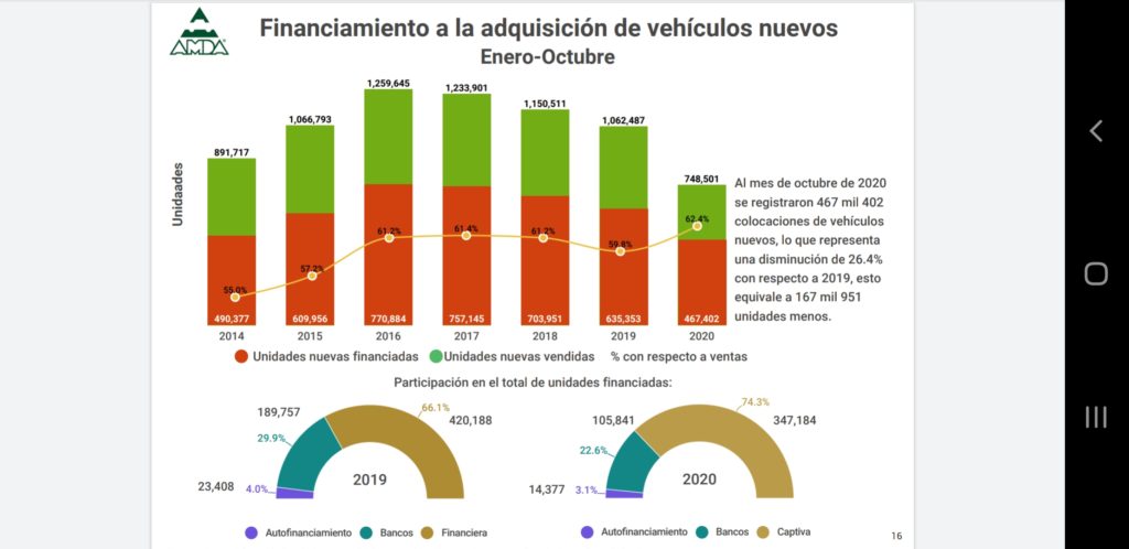 -Bajó 26.4% el financiamiento automotor y 23.6% la internación de vehículos usados a octubre de 2020, respectivamente.