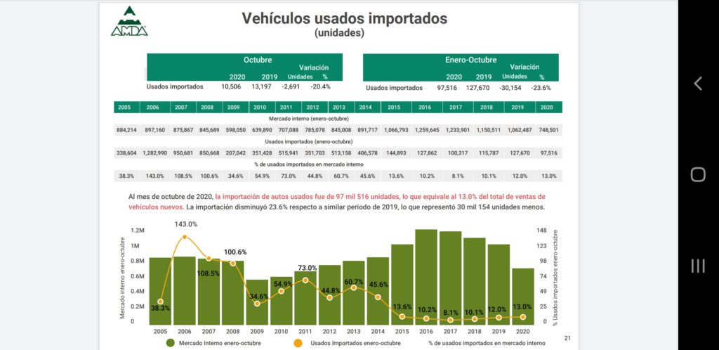 En cuanto a la internación de vehículos usados de Estados Unidos y Canadá a México, el directivo de la AMDA informó que entre enero y octubre de este año se han importado formalmente 97 mil 516, 30 mil 154 menos, equivalente a una contracción de 23.6 por ciento.