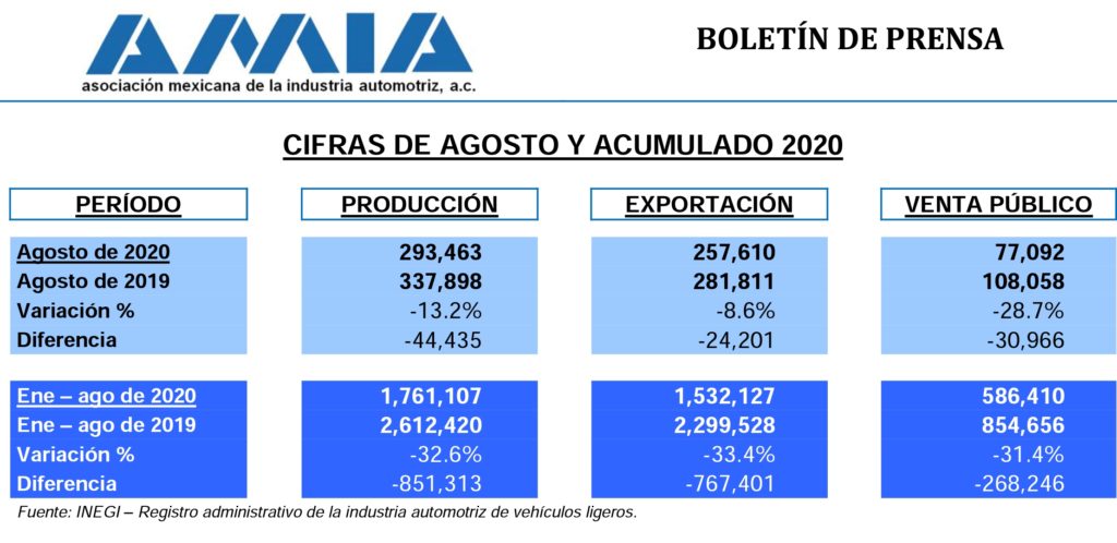 Durante agosto la producción de vehículos automotores en México registró 293,463 vehículos, lo que fue inferior a las 337,898 unidades de igual mes del año pasado, y con ello un descenso de 13.15%.