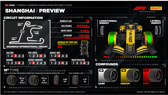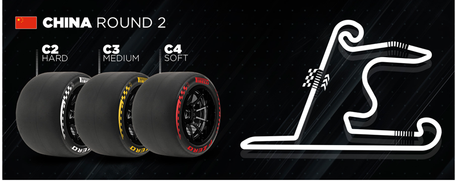 La selección de neumáticos para el fin de semana del Gran Premio de China se mantiene sin cambios desde que el circuito regresó al calendario del campeonato hace dos años. Los equipos utilizarán los neumáticos C2, C3 y C4 para afrontar la pista de 5,451 kilómetros.