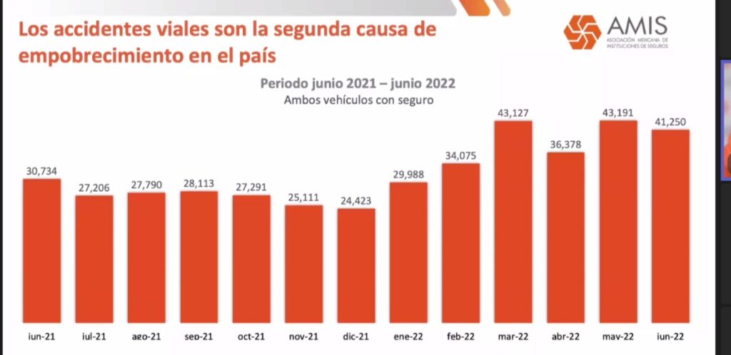 Lo que es preocupante, ya que de junio del año 2021 a junio del 2022, se registraron 41,250 accidentes viales, el equivalente a 44 muertes por día por accidentes viales. En este sentido, al cierre del año 2021, el sector asegurador cubrió daños por 20,410 millones de pesos a victimas por accidentes viales.