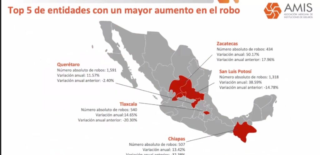 Así es que en el robo de vehículos, 6 estados concentran el 67% de las unidades aseguradas robadas, en donde entidades como Zacates, San Luis Potosí y Querétaro crecieron en 50%, 39% y 11% los robos, respectivamente.