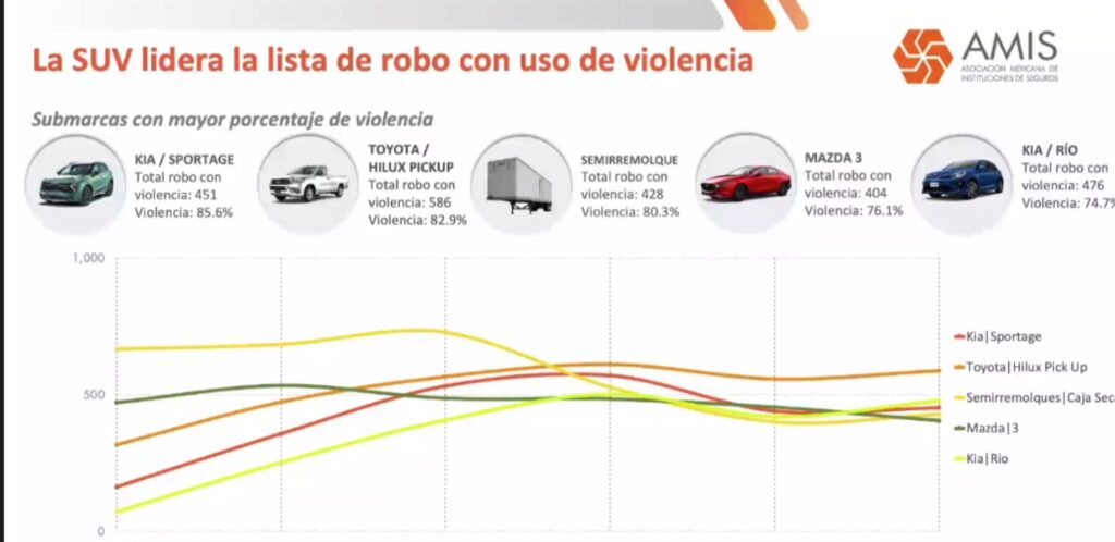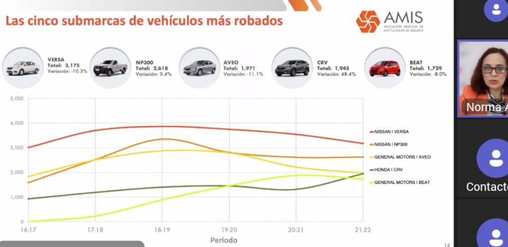 Y dentro de los modelos más robados, se puede citar al Nissan Versa, con 3,175 unidades; la Nissan NP300 ocupa el segundo lugar, con 2,618 unidades; el tercer lugar Aveo 1,971 unidades robadas; el cuarto lugar lo ocupa la Honda CR-V con 1,945 unidades robadas, para un aumento del 30%; y finalmente, el Beat de General Motors, con 1,729 unidades.
