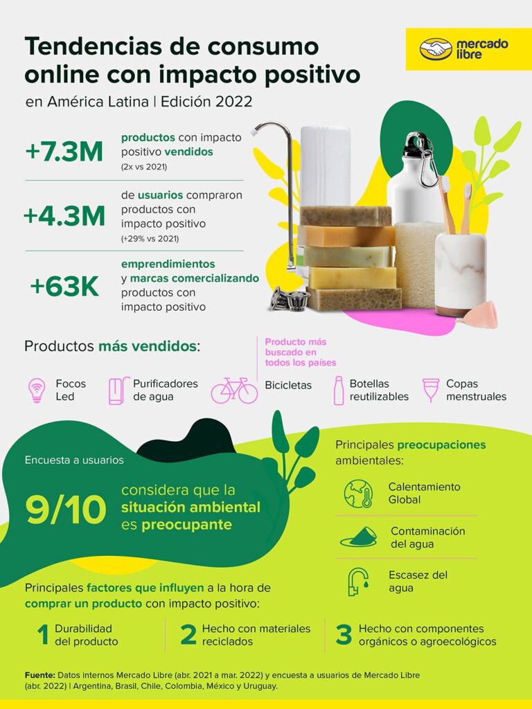 El consumo online de productos con impacto positivo sigue consolidándose en Latinoamérica, dado que más de 4.3 millones de personas adquirieron más de 7.3 millones de productos sustentables en el último año, duplicando los artículos vendidos, según datos del estudio “Tendencias de consumo online con impacto positivo”, elaborado por Mercado Libre.