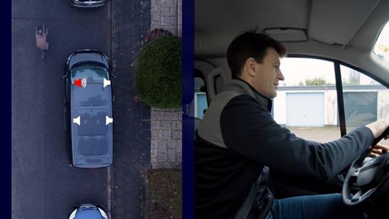 La Alerta Sonora Direccional lleva estos avisos un paso más allá. Un software desarrollado por Ford utiliza la información de los sensores para elegir el sonido adecuado y reproducirlo a través del altavoz más cercano al obstáculo.