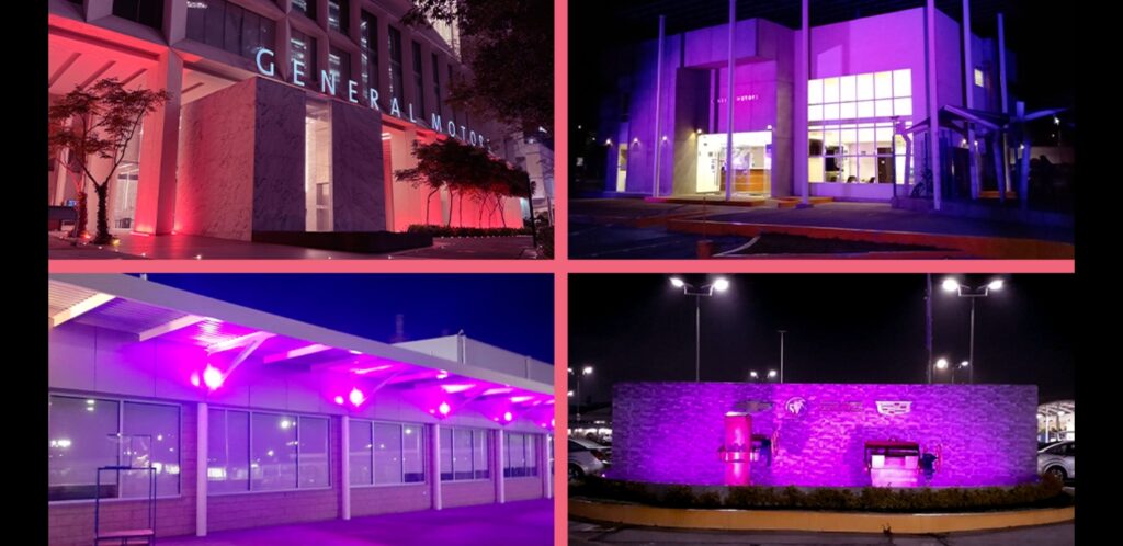 Como cada año, GM iluminó de rosa las instalaciones de sus plantas ubicadas en Estado de México, San Luis Potosí, Guanajuato y Coahuila, así como Torre GM, ubicada en la CDMX y su Centro Regional de Ingeniería en Toluca