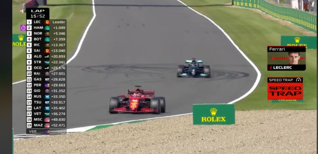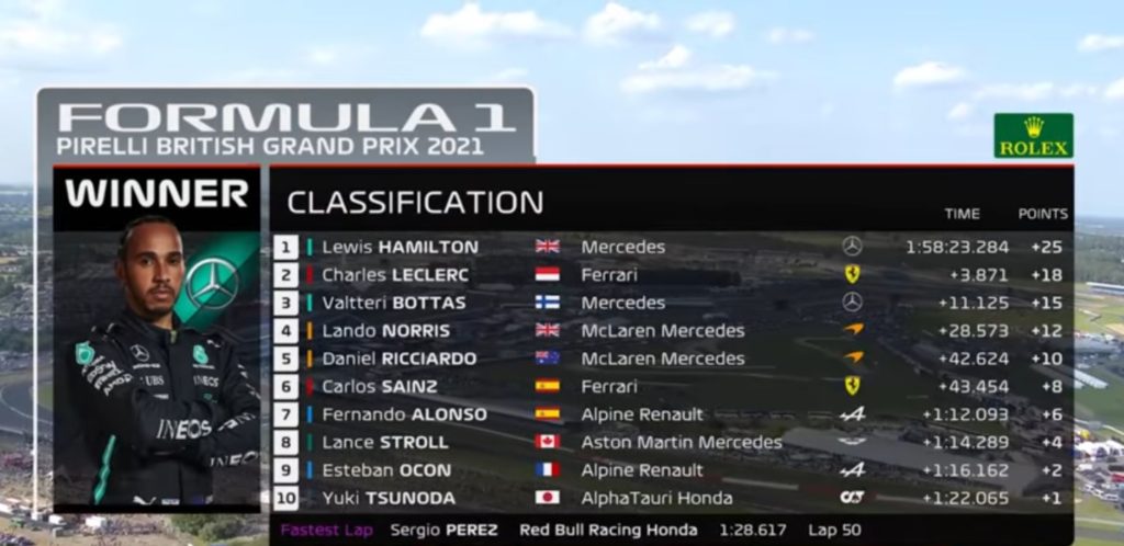 Luego de este accidente, Charles Leclerc de Ferrari tomó prácticamente el liderazgo de la carrera, hasta la vuelta 50 de 52, ya que Lewis Hamilton terminó llevándose el primer lugar, con su respectiva penalización de 10 segundos.