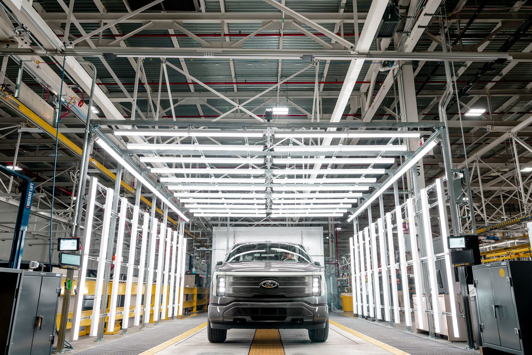 La tecnología de fabricación del Rouge Electric Vehicle Center es tan innovadora como F-150 Lightning. Es la primera planta de Ford sin líneas transportadoras de piso tradicionales y en su lugar utiliza vehículos robóticos autónomos guiados para mover camiones F-150 Lightning de una estación de trabajo a otra en la planta.