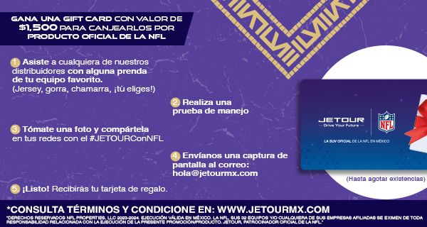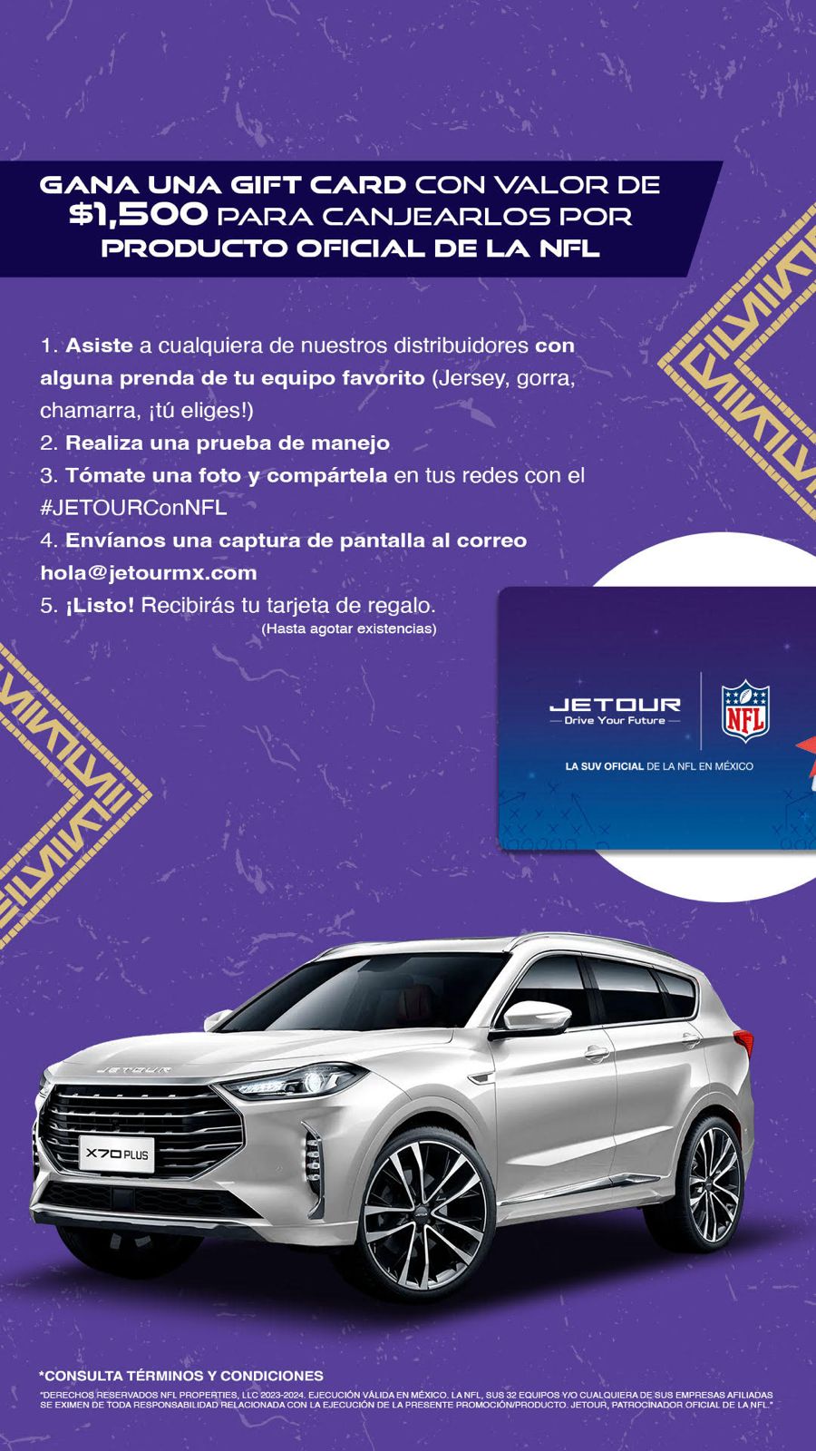 Ciudad de México, 8 de enero de 2024.- JETOUR, la SUV oficial de la NFL, invita a los fanáticos de NFL a visitar su distribuidor más cercano y hacer una prueba de manejo para ganar una tarjeta de regalo* con valor de $1,500 pesos para canjearlo por producto oficial.
