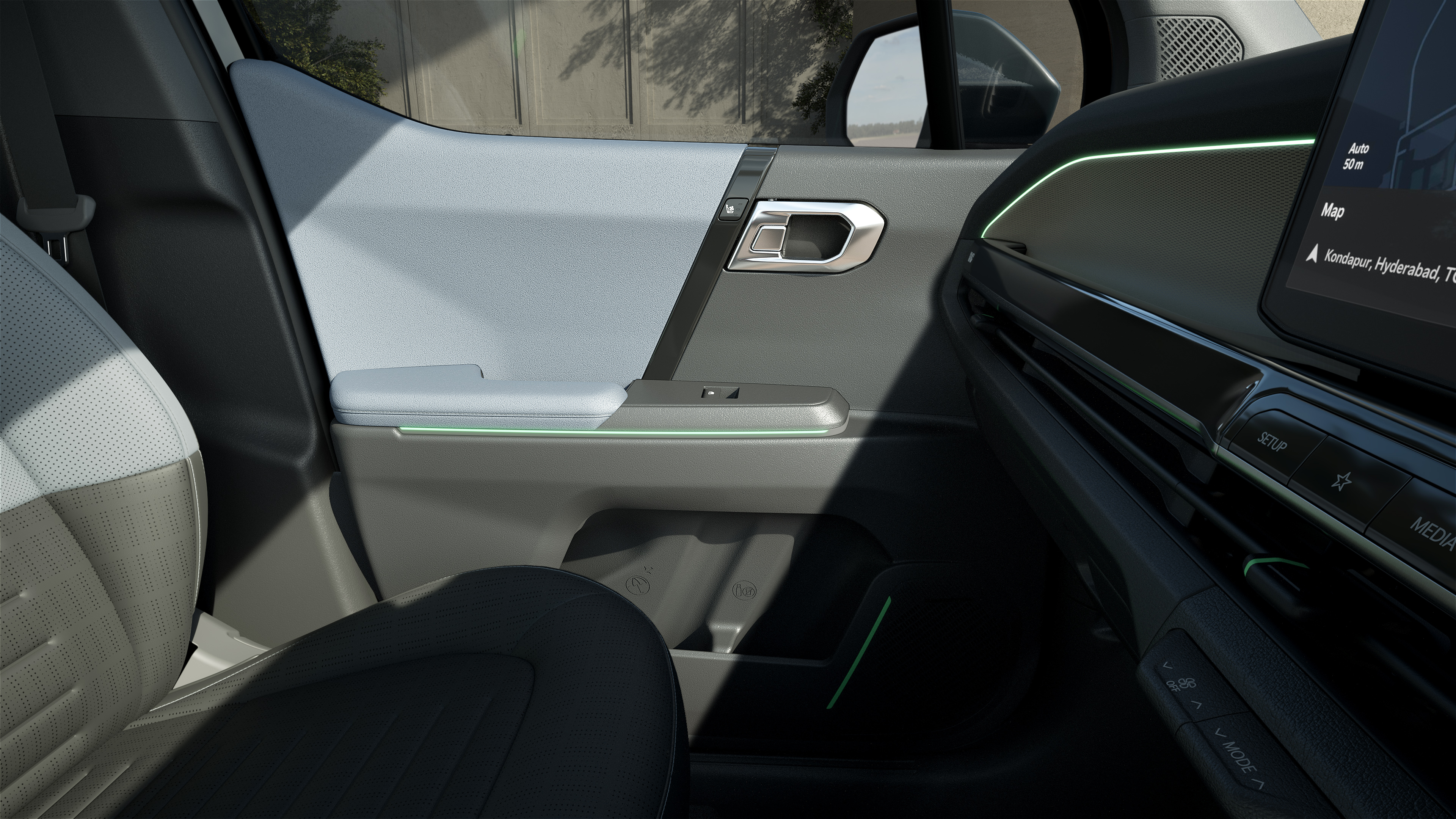 Con una distancia entre ejes de 2,550 mm, la cabina de Syros ofrece una experiencia interior cómoda y moderna, con asientos traseros deslizables y reclinables, divididos 60:40 que permiten ajustar el espacio del área de carga. Los asientos delanteros y traseros (primicia para la categoría) ventilados imponen un nuevo estándar de conveniencia. La cabina eleva aún más la experiencia de los pasajeros con un panel de pantalla panorámica Connected Car Navigation Cockpit segmentada de casi 30”, techo corredizo panorámico de doble panel, pedales deportivos de aluminio, iluminación ambiental de 64 colores, volante de doble corte en D, asiento del conductor eléctrico de 4 posiciones, creando una atmósfera de lujo moderno.