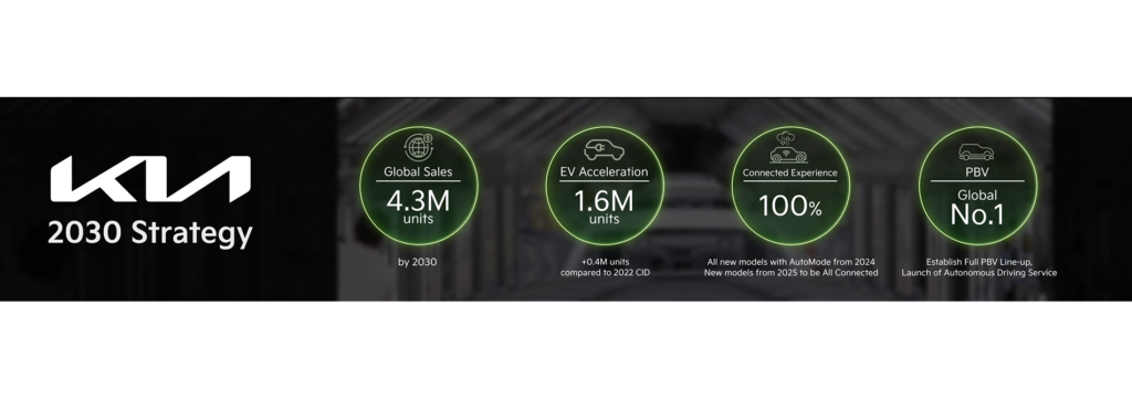 Durante el CEO Investor Day de 2023, Kia anunció objetivos actualizados y detalles específicos de su estrategia comercial. El objetivo de ventas globales de Kia para 2030 de 4.3 millones de unidades es un 34.4 por ciento más alto que su objetivo de ventas anuales para 2023 de 3.2 millones de unidades.