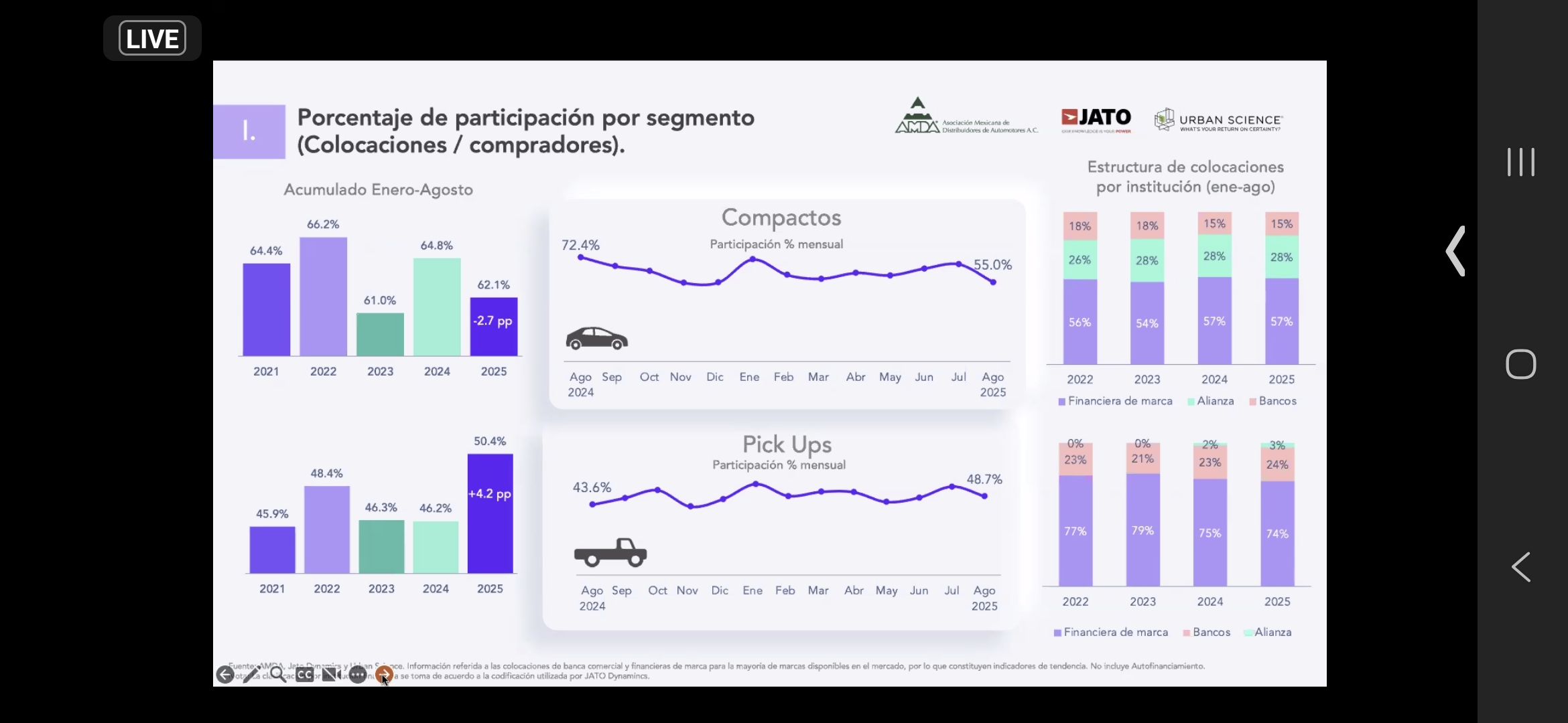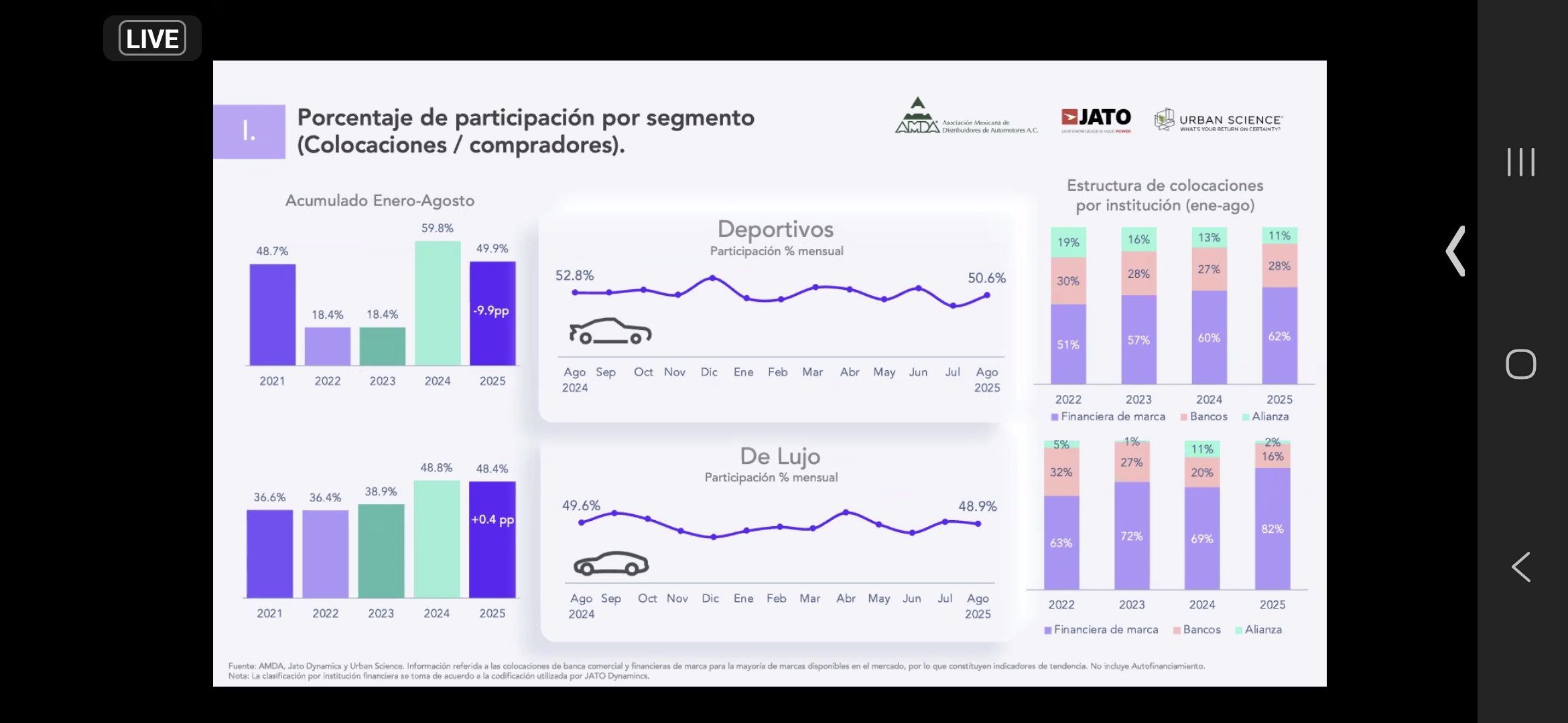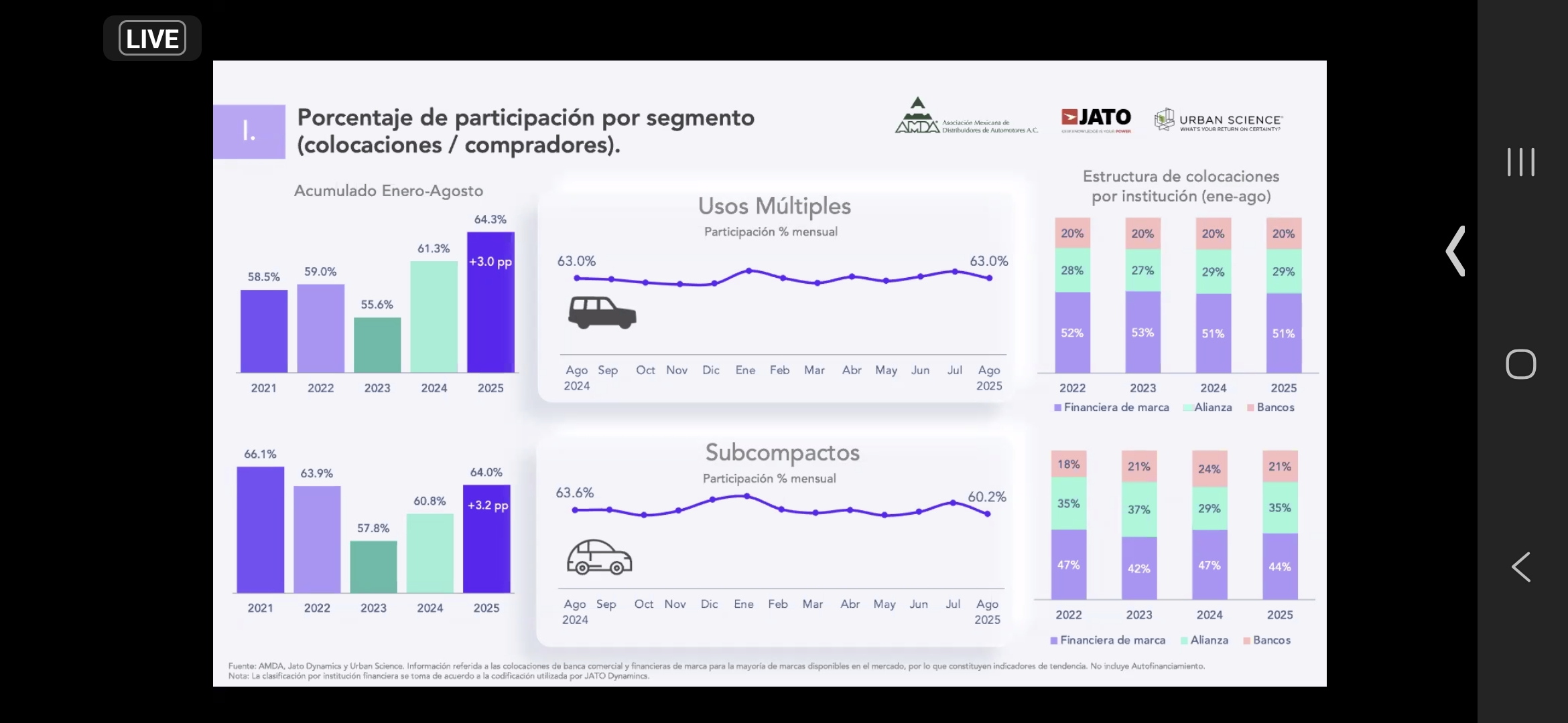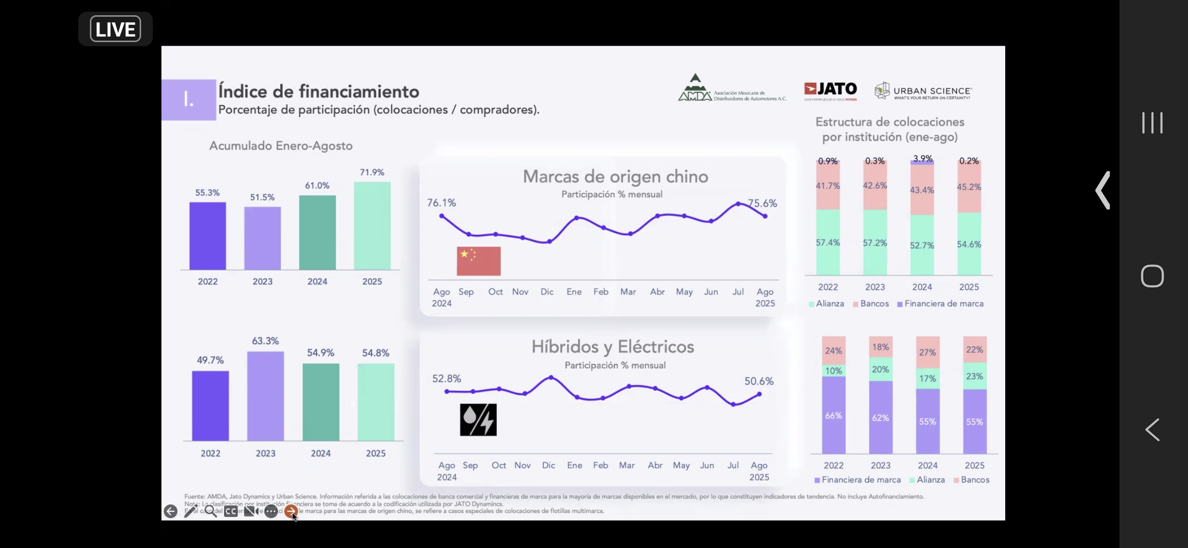 -Participación del crédito en la compra de vehículos nuevos de marcas chinas fue de 75.6 y 71.9% en agosto y su acumulado 2025, respectivamente