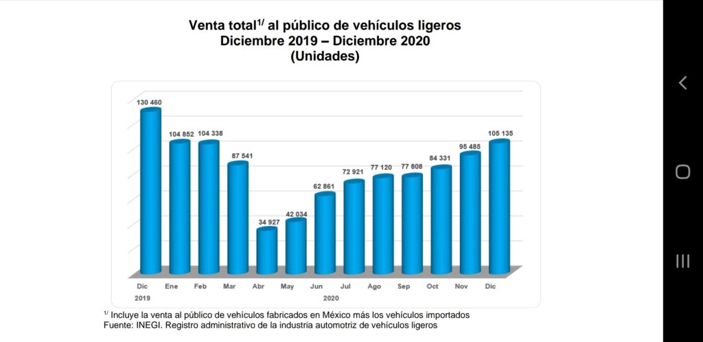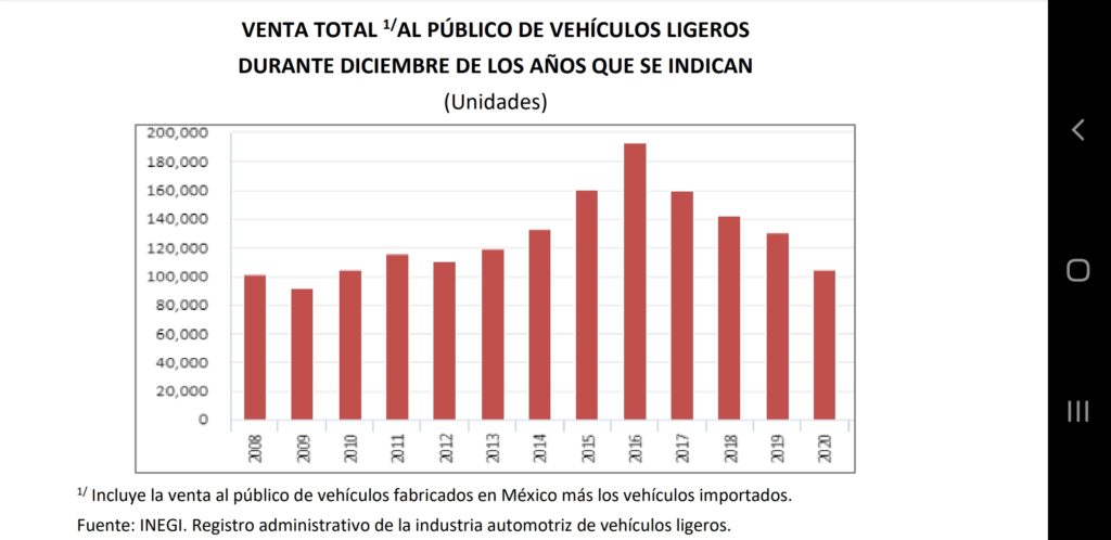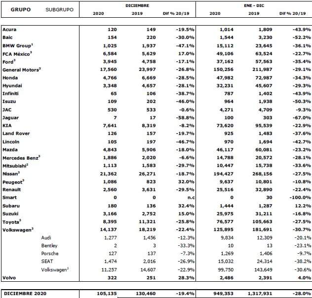 En diciembre del año pasado, se vendieron al público en el mercado interno de México 105,135 unidades, lo que fue inferior a las 130,460 unidades de igual mes del año 2019, lo que representó una caída del 19.4%.