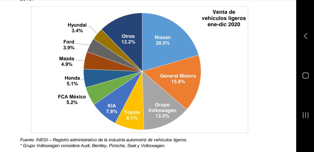 Por marcas, Nissan mantuvo el liderazgo con 194,427 ventas; General Motors con 150,256; Volkswagen 125,895; Toyota con 76,577; y con KIA 73,620 vehículos comercializados; con 2,957 unidades menos versus Toyota.