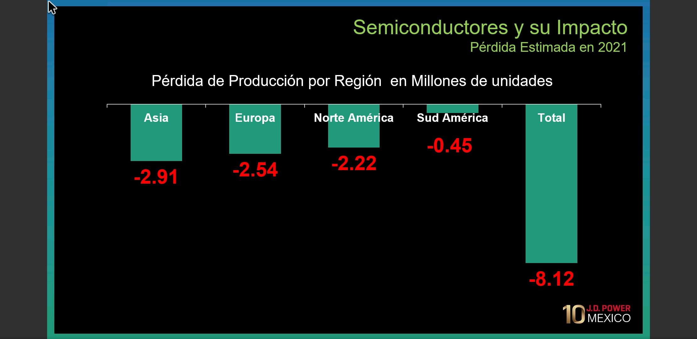Así es que el impacto por la falta de semiconductores fue como sigue: Norteamérica con 2.22 millones de unidades; Asia 2.91, Europa 2.54, y Sudamérica con 45 mil unidades, lo que da un total de 8.12 millones de unidades menos.