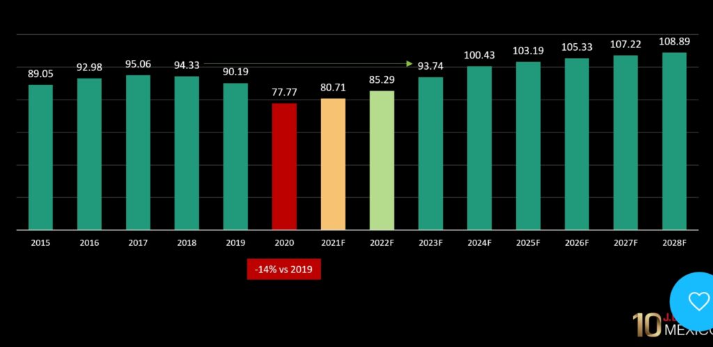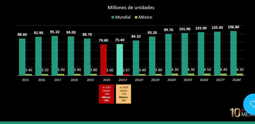 En conferencia de prensa, Gerardo Gómez, Director General de JD Power, dijo que la producción de vehículos a nivel mundial se estima en 75 millones para este año. Para México la cifra se proyecta en 3 millones de unidades en este año 2020 en México, y pudieron haber sido más, pero fue la falta de componentes que no permitirá llegar a más.