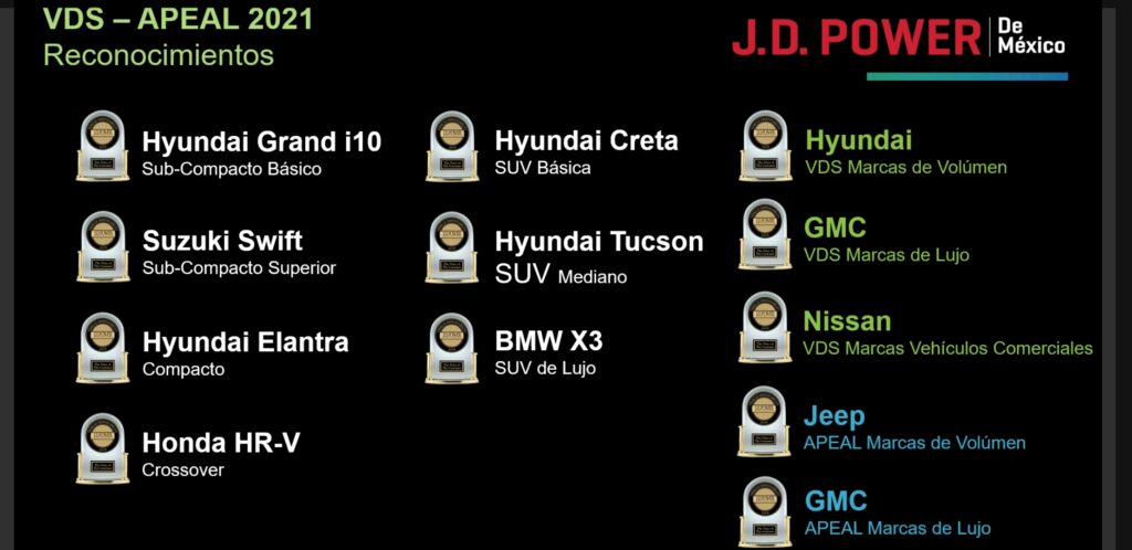 En el segmento de los compactos fue el Hyundai Elantra el mejor; y en las crossover fue la Honda HR-V; en las SUV básicas fue el Hyundai Creta; en las SUV medianas fue el Hyundai Tucson; y en las SUV de lujo el ganador fue el BMW X3, dijo Brais Álvarez, Gerente de Cuentas de JD Power.