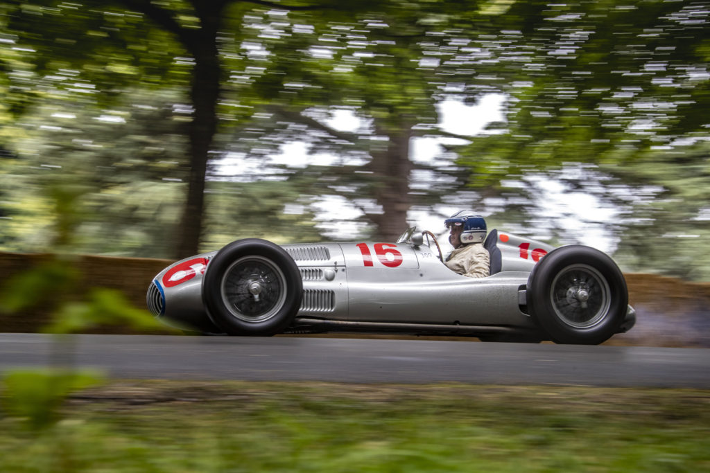 Mercedes-Benz 1,5-Liter-Rennwagen W 165 aus dem Jahr 1939, gefahren von Jochen Mass beim Goodwood Festival of Speed 2019. Mercedes-Benz 1.5-litre W 165 racing car from 1939, driven by Jochen Mass at the Goodwood Festival of Speed in 2019.