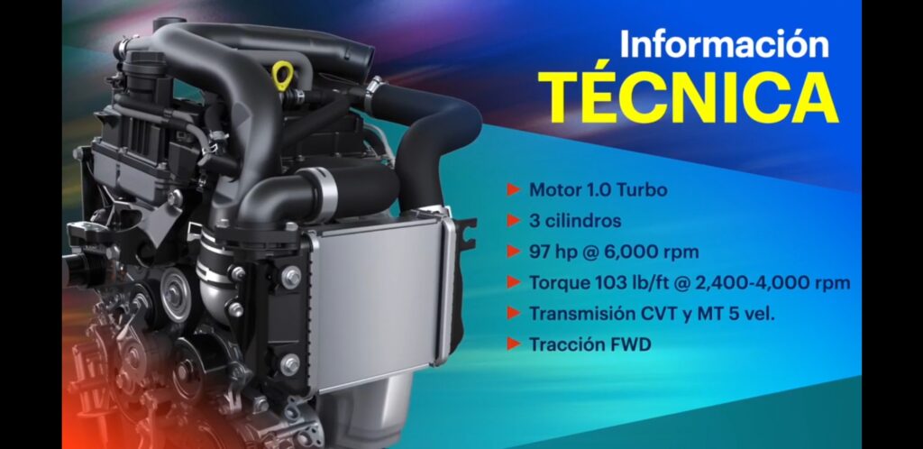 Esta pequeña camioneta SUV, cuenta con un motor de 1.0 litros turbo de desplazamiento, de 3 cilindros, 97 caballos de poder y 103 lb. pie de torque, con dos opciones de cajas de velocidades; una CVT y una manual de 5 velocidades.